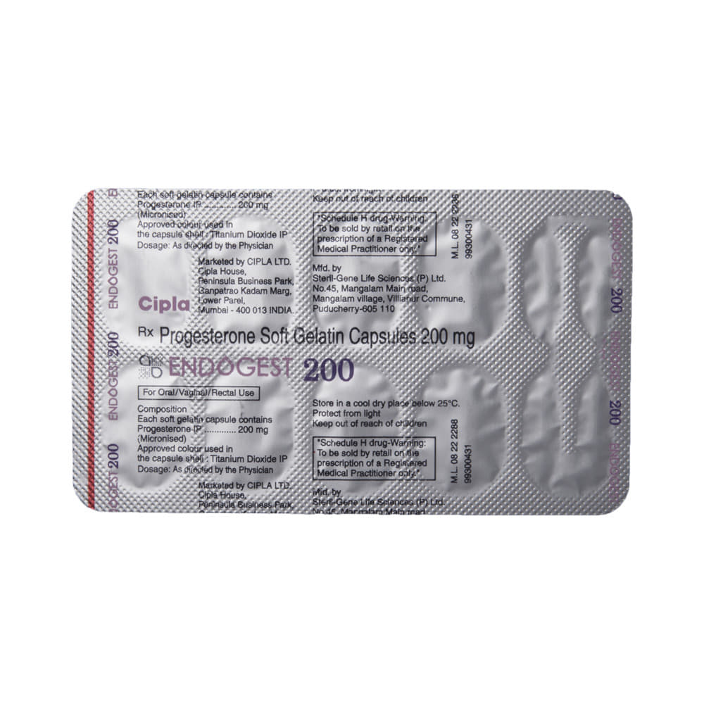 Endogest 200 Capsule is a natural female sex hormone, progesterone. It is used to treat menstrual and pregnancy-related issues that are caused by hormonal imbalance. Endogest 200 Capsule is also prescribed, along with estrogen, as a part of hormonal replacement therapy for preventing endometrial hyperplasia (thickening of the lining of the uterus). It should be taken with food. It should be taken at the same time each day to get the most benefit. You should continue taking it for as long as your doctor has told you to, even if you feel well.The most common side effects include headache, breast pain, irregular vaginal bleeding or spotting, stomach or abdominal cramps, bloating, nausea and vomiting, hair loss, edema, and vaginal yeast infection. Side effects are more common during the first few weeks and usually lessen as your body gets used to the medicine. You may also experience bleeding or spotting between your periods; consult with your doctor if it happens frequently.Before taking this medicine, inform your doctor if you have, or have had, breast cancer, unusual bleeding in the vagina, or liver disease. You will probably have several tests both before and during treatment to check your womb. Also, tell your doctor what other medicines you are taking, as some may affect, or be affected by, this medicine. In general, it is advisable to avoid alcohol and smoking.