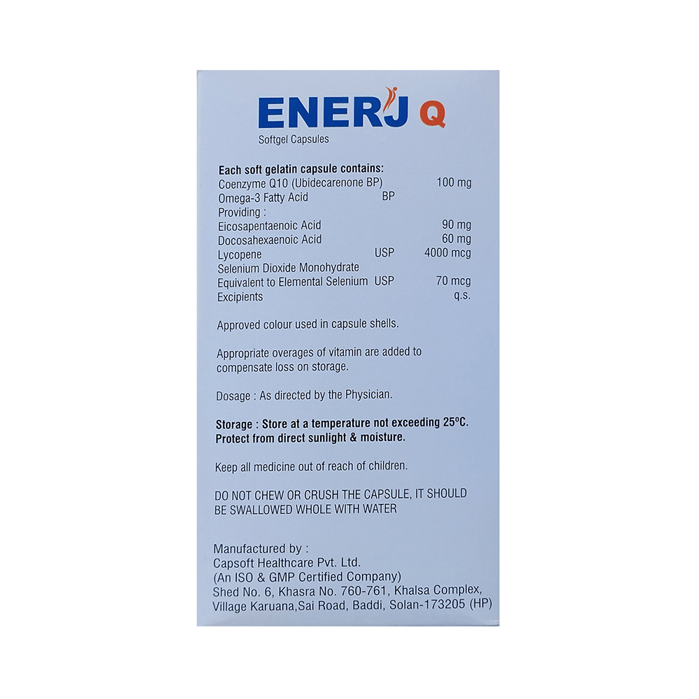 Enerj Q Softgel Capsule is a combination of vitamins, antioxidants, and minerals. Coenzyme Q10 is a fat-soluble compound that helps the mitochondria (the powerhouse of cells) convert food into energy, and it's also an antioxidant. Docosahexaenoic acid (DHA) is vital for the growth and functional development of the brain in babies. In adults, It is also needed for maintenance of normal brain function. DHA improves learning ability, whereas deficiencies of DHA are associated with deficits in learning. Eicosapentaenoic acid prevents the blood from clotting easily, reduces triglyceride levels, and may reduce pain and swelling. Lycopene protects the body from damaging molecules called free radicals and helps boost the immune system. Selenium dioxide acts as a resource of selenium that prevents cell damage and protects the body from the poisonous effects of heavy metals and harmful radicals.