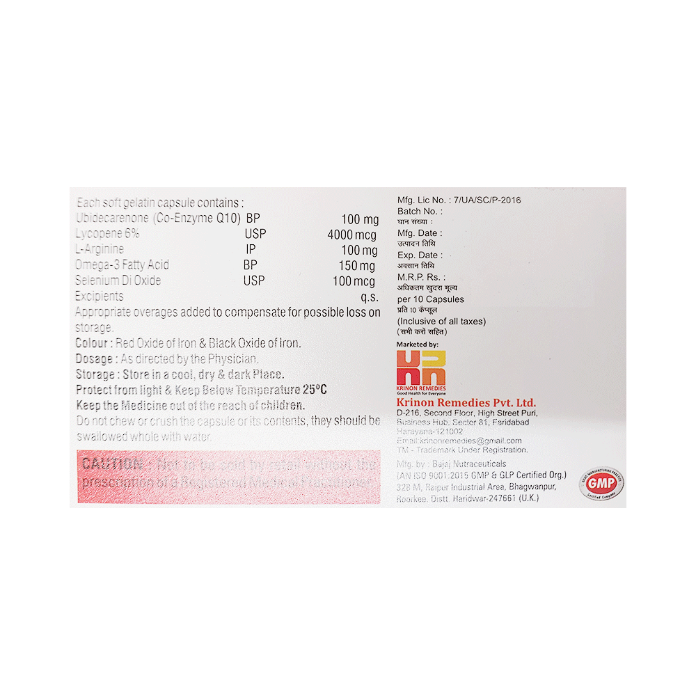 Salt Composition: Coenzyme Q10 (100mg) + L-Arginine (100mg) + Lycopene (4000mcg) + Omega-3 fatty acid (150mg) + Selenium dioxide (100mcg)