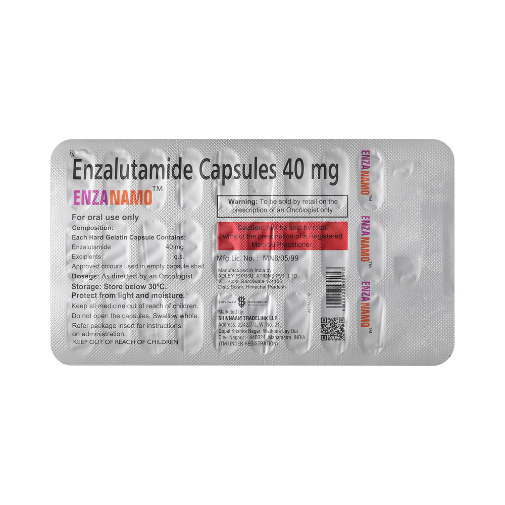 Enzanamo Capsule is used in the treatment of cancer of the prostate gland. It may be also used to treat other conditions, as determined by the doctor. It works by blocking the effects of male hormones such as testosterone. Enzanamo Capsule should be taken with or without food, preferably at a fixed time every day. Your doctor will decide what dose is necessary and how often you need to take it. This will depend on what you are being treated for and may change from time to time. You should take it exactly as your doctor has advised. Taking it in the wrong way or taking too much can cause very serious side effects. It may take several weeks or months for you to see or feel the benefits but do not stop taking it unless your doctor tells you to.Headache, hot flashes, weakness and high blood pressure is very common side effect of this medicine. Other than this, fractures, falls, dry skin, pruritus,decreased appetite, and constipation might be observed as side effects. Regular blood tests are required to check your blood cells along with liver function during treatment with this medicine. It makes your skin more sensitive towards sunlight, hence take extra caution while going out.Before taking it, tell your doctor if have diabetes, seizures, liver, or kidney problems or are taking any medicines to treat infections. Many other medicines can affect, or be affected by, this medicine so let your doctor know all medications you are using. This medicine is not recommended during pregnancy or while breastfeeding. The use of effective contraception by both males and females during treatment is important to avoid pregnancy. You may be asked for regular monitoring of blood glucose level while on treatment.