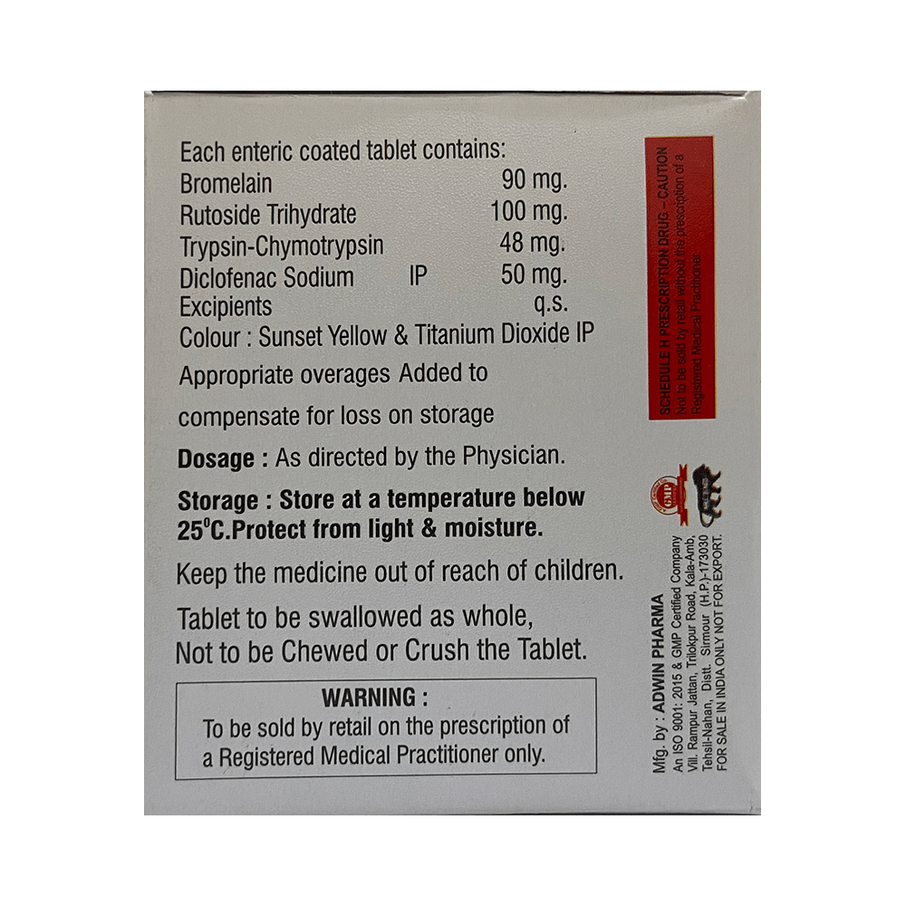 Salt Composition: Bromelain (90mg) + Diclofenac (50mg) + Rutoside (100mg) + Trypsin Chymotrypsin (48mg)