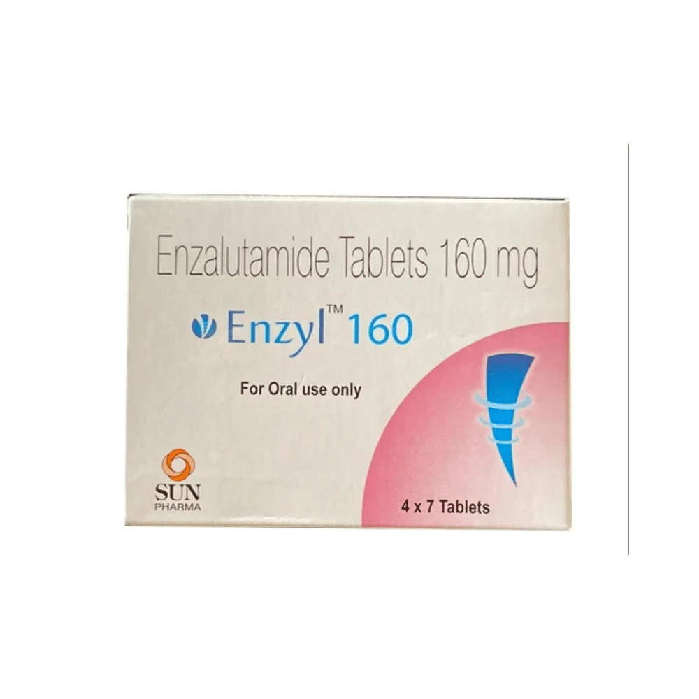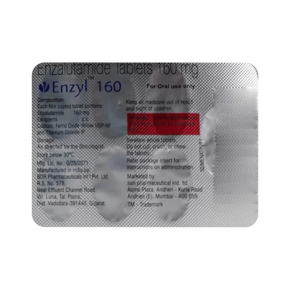 Enzyl 160mg Tablet is used in the treatment of cancer of the prostate gland. It may be also used to treat other conditions, as determined by the doctor. It works by blocking the effects of male hormones such as testosterone. Enzyl 160mg Tablet should be taken with or without food, preferably at a fixed time every day. Your doctor will decide what dose is necessary and how often you need to take it. This will depend on what you are being treated for and may change from time to time. You should take it exactly as your doctor has advised. Taking it in the wrong way or taking too much can cause very serious side effects. It may take several weeks or months for you to see or feel the benefits but do not stop taking it unless your doctor tells you to.Headache, hot flashes, weakness and high blood pressure is very common side effect of this medicine. Other than this, fractures, falls, dry skin, pruritus,decreased appetite, and constipation might be observed as side effects. Regular blood tests are required to check your blood cells along with liver function during treatment with this medicine. It makes your skin more sensitive towards sunlight, hence take extra caution while going out.Before taking it, tell your doctor if have diabetes, seizures, liver, or kidney problems or are taking any medicines to treat infections. Many other medicines can affect, or be affected by, this medicine so let your doctor know all medications you are using. This medicine is not recommended during pregnancy or while breastfeeding. The use of effective contraception by both males and females during treatment is important to avoid pregnancy. You may be asked for regular monitoring of blood glucose level while on treatment.