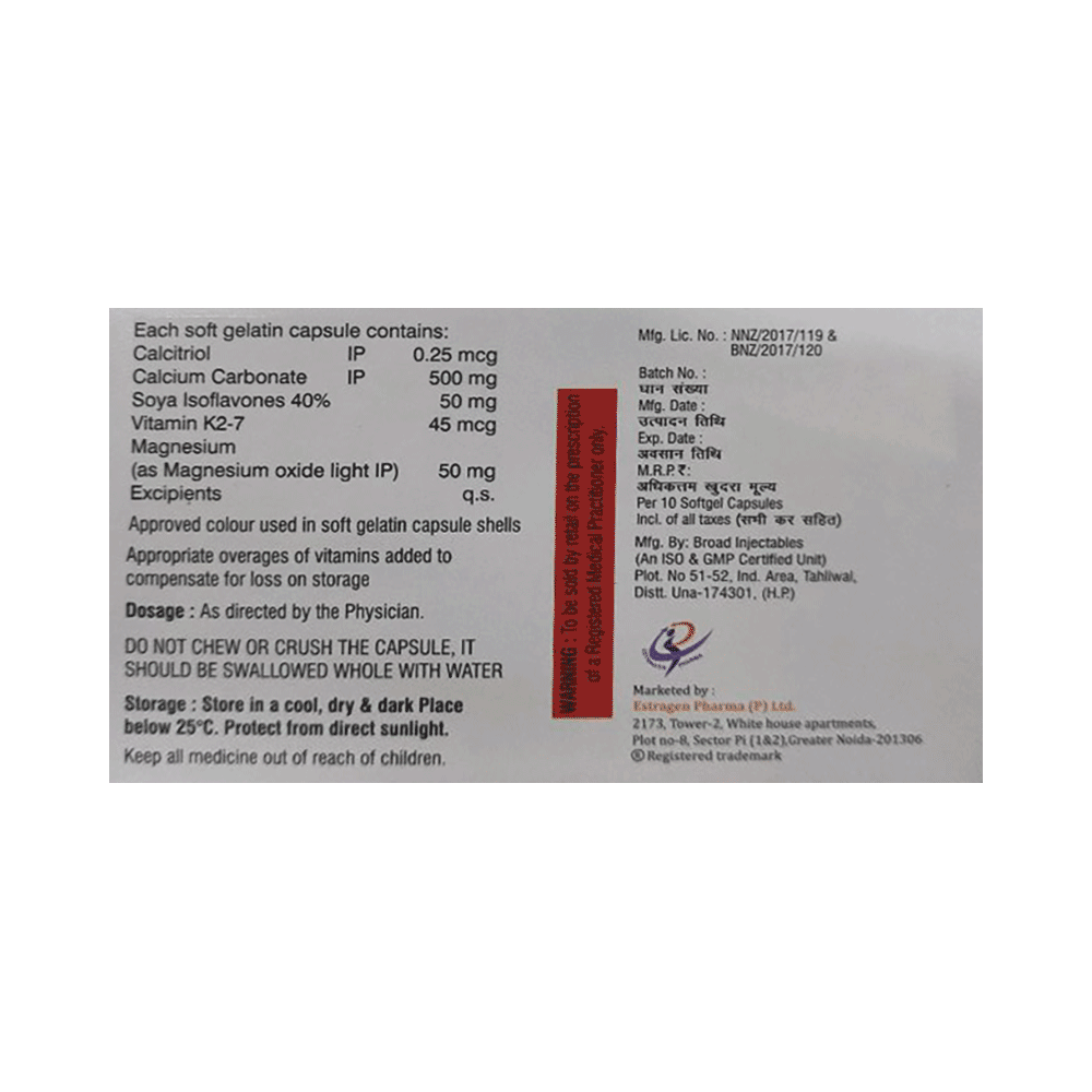 Salt Composition: Calcitriol (0.25mcg) + Calcium Carbonate (500mg) + Magnesium Oxide (50mg) + Soya Isoflavones (50mg) + Vitamin K2-7 (45mcg)