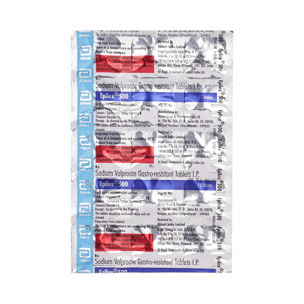 In Epilepsy/SeizuresEPIlex 500 Tablet is an anticonvulsant (or anti-epileptic) medicine that works by decreasing the nerve impulses which cause the seizures. By controlling the frequency of seizures, it will help you go about your daily activities with more confidence. It helps reduce symptoms such as confusion, uncontrollable jerking movements, loss of awareness, and fear or anxiety.This medicine is not associated with any physical or psychological dependence (addiction) but it should not be stopped suddenly. It must be taken regularly as prescribed to be effective. Missing doses may trigger a seizure.In Bipolar disorderEPIlex 500 Tablet works to restore the normal balance of nerve activity in your brain. It can help prevent extreme changes in mood and help you feel less agitated. You may experience fewer episodes of low mood. It can take several weeks for this medicine to work and you may still feel low during this time. It is likely that you will take this medicine for at least six months but possibly much longer. It needs to be taken regularly to work effectively. Do not stop taking it unless your doctor advises you to. You should continue to eat well and keep fit to reduce symptoms of bipolar disorder.show moreshow less