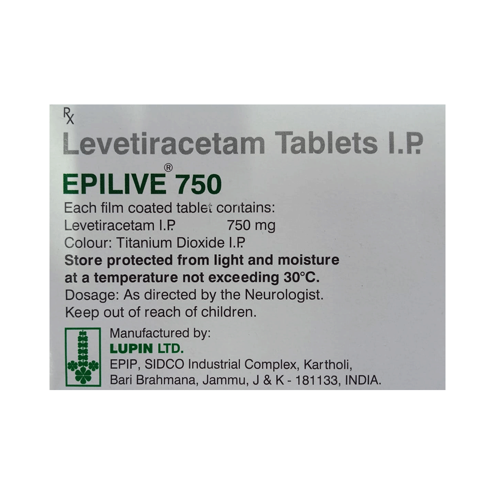 Epilive 750 Tablet is an anti-epileptic medicine used to treat seizures (fits) in epilepsy. It can be used alone or along with other medicines. It helps to prevent seizures for as long as you continue to take it. Epilive 750 Tablet suppresses the abnormal electrical activity in the brain. You can take it with or without food but try to take it at the same time each day to get the most benefit. The dose will depend on your condition and how you respond to the medicine. Your doctor will advise the right dose for you. It is generally advised as a long-term treatment. You should continue taking it for as long as your doctor has told you to, even if you feel well. If you stop or miss doses your seizures could get worse.Some common side effects of this medicine include headache, irritation, sleepiness, behavior changes, aggressive behavior, and decreased appetite. Side effects are more common during the first few weeks and usually lessen as your body gets used to the medicine. Most of these side effects do not need medical attention, but some of them can be serious. A small number of people being treated with this medicine have had thoughts of harming or killing themselves. Contact your doctor if your mood changes for the worse.Before taking it, you should tell your doctor if you have kidney problems, depression, or suicidal thoughts and if you are pregnant, planning to become pregnant, or breastfeeding. Your doctor may suggest regular blood tests to monitor your kidney function while taking this medicine.