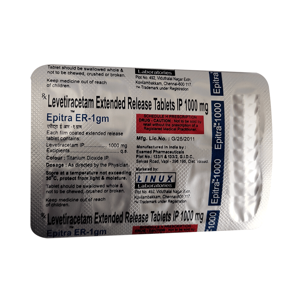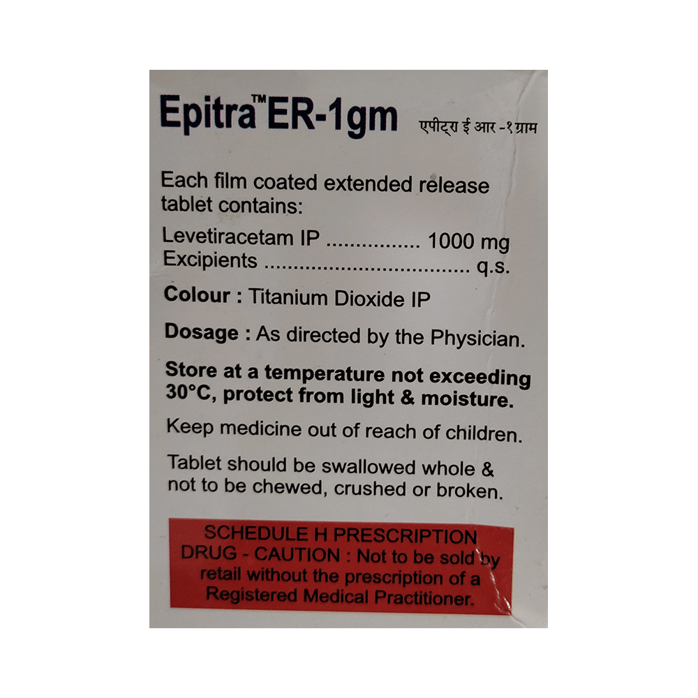 Epitra ER 1gm Tablet is an anti-epileptic medicine used to treat seizures (fits) in epilepsy. It can be used alone or along with other medicines. It helps to prevent seizures for as long as you continue to take it. Epitra ER 1gm Tablet suppresses the abnormal electrical activity in the brain. You can take it with or without food but try to take it at the same time each day to get the most benefit. The dose will depend on your condition and how you respond to the medicine. Your doctor will advise the right dose for you. It is generally advised as a long-term treatment. You should continue taking it for as long as your doctor has told you to, even if you feel well. If you stop or miss doses your seizures could get worse.Some common side effects of this medicine include headache, irritation, sleepiness, behavior changes, aggressive behavior, and decreased appetite. Side effects are more common during the first few weeks and usually lessen as your body gets used to the medicine. Most of these side effects do not need medical attention, but some of them can be serious. A small number of people being treated with this medicine have had thoughts of harming or killing themselves. Contact your doctor if your mood changes for the worse.Before taking it, you should tell your doctor if you have kidney problems, depression, or suicidal thoughts and if you are pregnant, planning to become pregnant, or breastfeeding. Your doctor may suggest regular blood tests to monitor your kidney function while taking this medicine.
