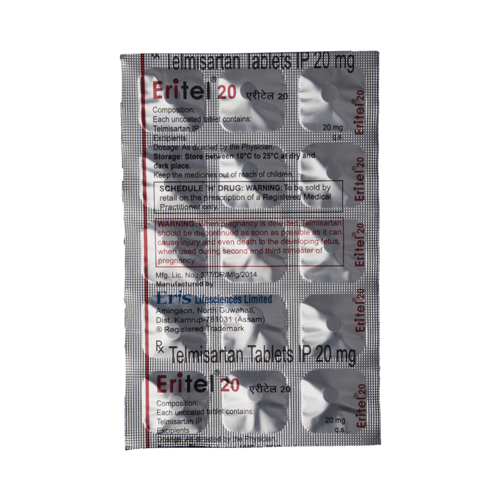Eritel 20 Tablet is a medicine used to treat high blood pressure and heart failure. Lowering blood pressure helps prevent future heart attacks and strokes. This medicine is also effective in preserving kidney function in patients with diabetes. Eritel 20 Tablet can be prescribed either alone or in combination with other medicines. It can be taken with or without food, but take it at the same time every day to obtain effective results. It is important to continue taking it regularly even if you feel well or if your blood pressure is controlled. Most people with high blood pressure do not feel ill, but if you stop taking this medicine, your condition could get worse. This is a widely used medicine and is considered safe for long-term use.Making some changes in your lifestyle will also help lower your blood pressure. These may include regular exercise, losing weight, smoking cessation, reducing alcohol intake, and reducing the amount of salt in your diet as advised by your doctor.Common side effects of Eritel 20 Tablet include diarrhea, back pain, sinus inflammation, and skin ulcers. Let your doctor know if any of these side effects bother you or worsen. They may be able to help by reducing the dosage or by prescribing you an alternate medicine.Before taking this medicine, let your doctor know if you have any kidney or liver problems. Pregnant or breastfeeding mothers should also consult their doctor before taking it. Your doctor may check your kidney function, blood pressure, and potassium levels in your blood at regular intervals while you are taking this medicine.