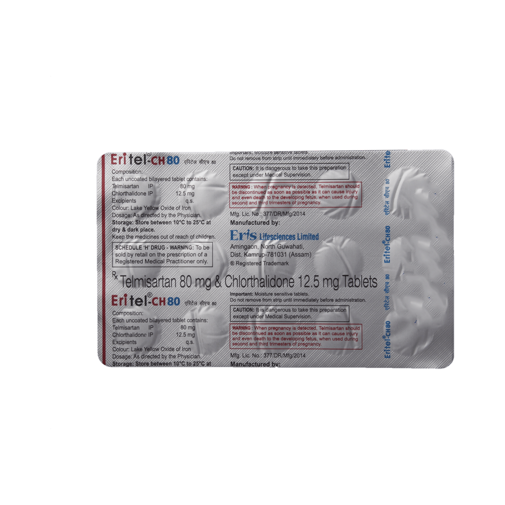 In Hypertension (high blood pressure)ERItel CH 80 Tablet is a combination of two medicines namely Telmisartan and chlorthalidone. It is generally used when one medicine alone is not controlling your blood pressure effectively. Telmisartan works by relaxing and widening your blood vessels so your blood can flow more easily. This will lower your blood pressure. Chlorthalidone is known as a diuretic (water pill) which increases urine output thereby lowering blood pressure. If your blood pressure is controlled you are less at risk of having a heart attack, stroke, or kidney problems. The medicine must be taken regularly as prescribed to be effective. You do not usually feel any direct benefit from taking this medicine, but it works in the long term to keep you well.