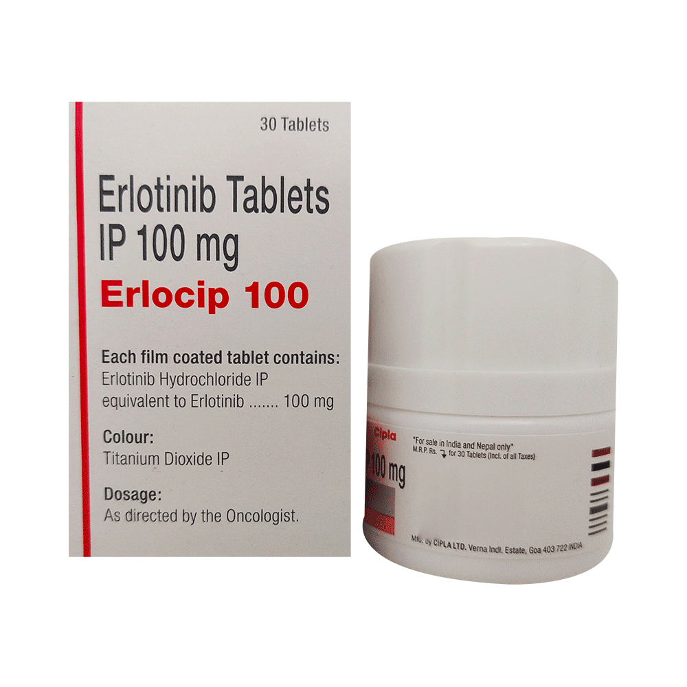 Erlocip 100 Tablet is used in the treatment of non-small cell lung cancer and pancreatic cancer. Erlocip 100 Tablet should be taken on an empty stomach or should be taken one hour before or 2 hour after meal. You should continue to take it as long as your doctor advises it. The duration of treatment varies according to your needs and response to treatment. You should take it exactly as your doctor has advised. Taking it in the wrong way or taking too much can cause very serious side effects. It may take several weeks or months for you to see or feel the benefits but do not stop taking it unless your doctor tells you to.The most common side effects of this medicine include nausea, vomiting, fatigue, rash, and weight loss. It may cause severe diarrhea, drink plenty of fluids or consult with your doctor if it bothers you. It makes you sensitive towards sunlight, hence wear protective clothing or use sunscreen while going out. In case you develop ulceration in mouth, changes in your vision, or breathing difficulties than it is better to inform the doctor. Your doctor may advise for regular monitoring of liver function while you are taking this medicine.Many other medicines can affect, or be affected by, this medicine so let your healthcare team know all medications you are using. This medicine is not recommended during pregnancy or while breastfeeding. The use of effective contraception by both males and females during treatment is important to avoid pregnancy. It is advised to quit smoking while taking this medicine as it can affect the working of the medicine. If you have to take an antacid or any other medicine, take it at a gap of at least 2 hours after taking the cancer medicine.