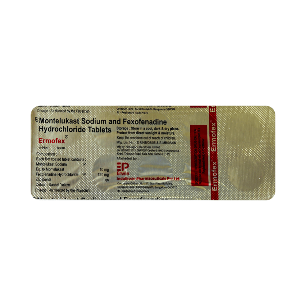 Ermofex Tablet is a combination medicine used in the treatment of allergy symptoms such as runny nose, stuffy nose, sneezing, watery eyes, and congestion or stuffiness. Ermofex Tablet is taken with or without food in a dose and duration as advised by the doctor. The dose you are given will depend on your condition and how you respond to the medicine. You should keep taking this medicine for as long as your doctor recommends. If you stop treatment too early your symptoms may come back and your condition may worsen. Let your healthcare team know about all other medications you are taking as some may affect, or be affected by this medicine.The most common side effects include nausea, diarrhea, vomiting, skin rash, flu-like symptoms, and headache. Most of these are temporary and usually resolve with time. Contact your doctor straight away if you are at all concerned about any of these side effects. This medicine may cause dizziness and sleepiness, so do not drive or do anything that requires mental focus until you know how this medicine affects you. Avoid drinking alcohol while taking this medicine as it can worsen your sleepiness.Never support self-medication or recommend your medicine to another person. It is beneficial to have plenty of fluids while taking this medication. Before you start taking this medicine it is important to inform your doctor if you are suffering from liver or kidney disease. You should also tell your doctor if you are pregnant, planning pregnancy or breastfeeding.