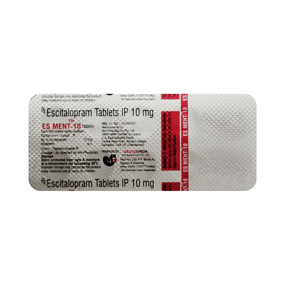 Es Ment 10 Tablet is widely prescribed to treat depression and other mental health conditions like anxiety, panic disorder, and obsessive-compulsive disorder. It is a type of antidepressant known as a selective serotonin reuptake inhibitor (SSRI). Es Ment 10 Tablet helps recover from depression by improving mood and relieving anxiety and tension. It can be taken with or without food. The dose and how often you need it will be decided by your doctor based on the amount needed to control your symptoms. Your doctor may start you on a lower dose and increase it gradually. Do not change the dose or stop taking it without talking to your doctor, even if you feel well. Doing so may make your condition worse or you may suffer from unpleasant withdrawal symptoms such as anxiety, restlessness, palpitations, dizziness, sleep disturbances.To get the most benefit, take this medicine regularly at the same time each day. Your doctor may advise you to take it in the morning if you have trouble sleeping. It may take a few weeks before you start feeling better. Let your doctor know if you do not see any improvement even after 4 weeks.Some common side effects of this medicine include nausea, fatigue, increased sweating, insomnia (difficulty in sleeping), decreased sexual drive, delayed ejaculation, and women may experience difficulties achieving orgasm. Some people may experience sleepiness after taking this medicine. Let your doctor know straight away if you develop any sudden worsening of mood or any thoughts about harming yourself.Before taking Es Ment 10 Tablet, you should tell your doctor if you have epilepsy (seizure disorder or fits), diabetes, liver or kidney disease, any heart problems, or are currently taking medicines for depression known as MAO inhibitors. These may affect your treatment. Please tell your doctor about all the medicines you are taking to make sure you are safe.