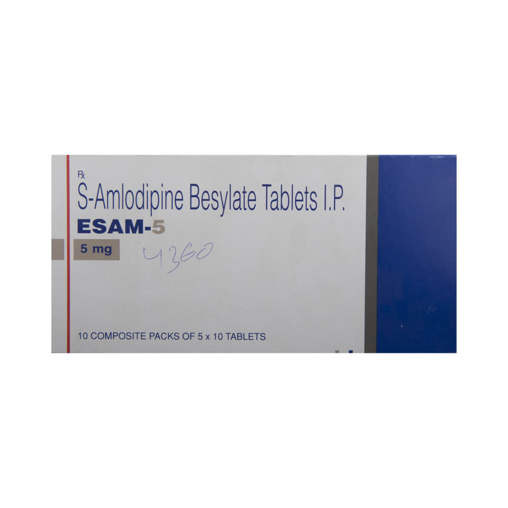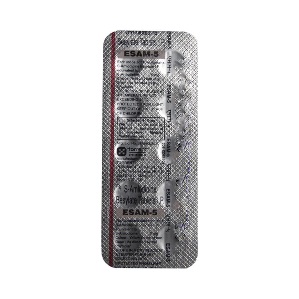 In Prevention of Heart attackeSAM 5 Tablet helps lower your blood pressure and make it easier for your heart to pump blood around your body. This reduces the chances of you having a heart attack. It can also reduce the risk of dying if it is given immediately after a heart attack. This medicine needs to be taken regularly to be effective, so keep taking it even if you feel well. Do not stop without talking to your doctor.In Treatment of Hypertension (high blood pressure)eSAM 5 Tablet is a calcium channel blocker. It works by relaxing the blood vessels so that blood can flow more easily around your body. This lowers your blood pressure and reduces your risk of having a stroke, a heart attack, or kidney problems in the future. You do not usually feel any direct benefit from taking this medicine, but it works in the long term to keep you well. Take regularly, as prescribed for this medicine to be most effective, even if you feel better.In Prevention of StrokeeSAM 5 Tablet reduces the risk of future strokes. It helps lower your blood pressure and make it easier for your heart to pump blood around your body. This reduces the chances of you having a stroke. Take it as advised by the doctor to get the maximum benefit.show moreshow less