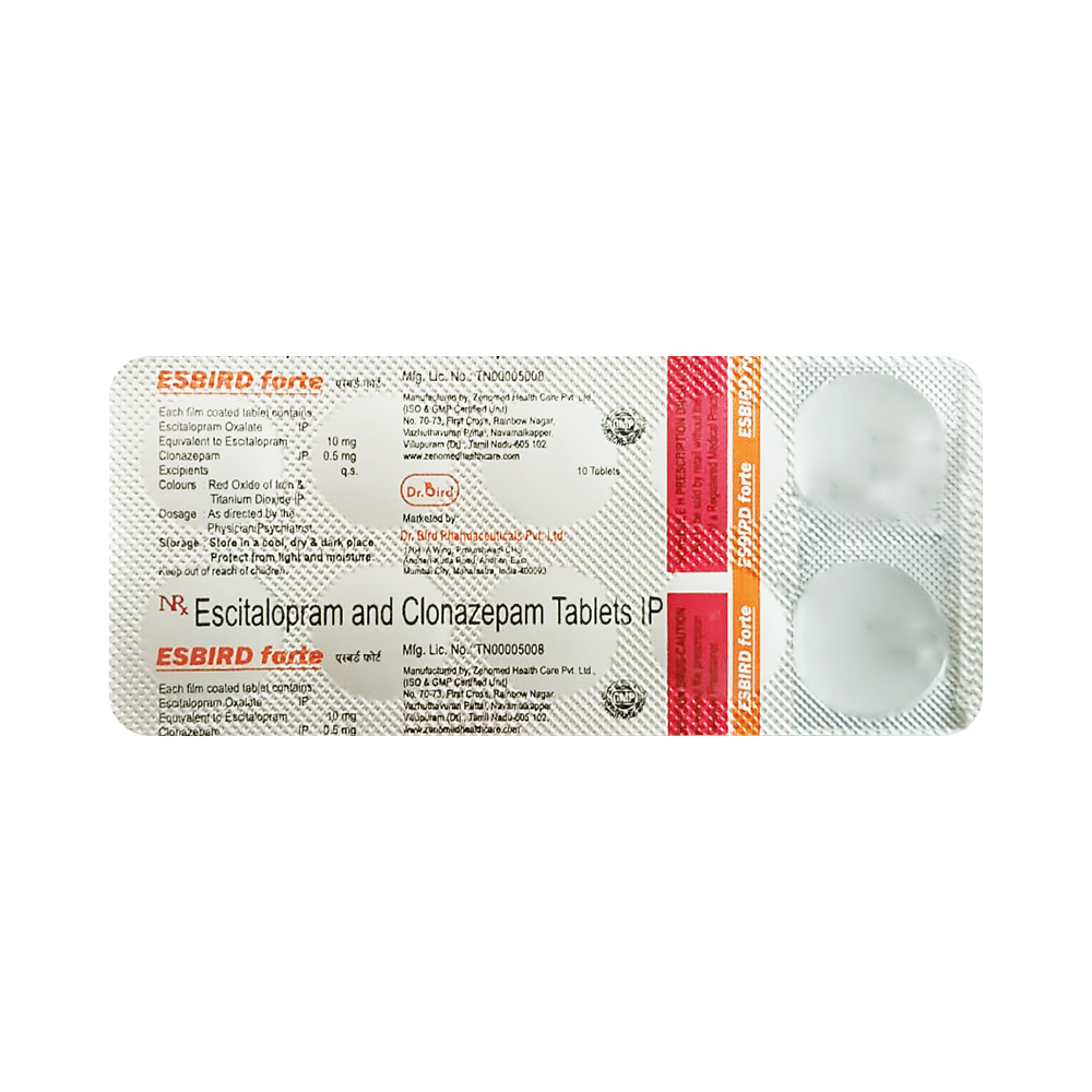 Esbird Forte Tablet is a prescription medicine used to treat anxiety disorder. It is the combination medicine that calms the brain by decreasing the abnormal and excessive activity of the nerve cells. It also works by increasing the level of a chemical messenger in the brain which improves mood. Esbird Forte Tablet can be taken with or without food. However, it is advised to take it at the same time each day as this helps to maintain a consistent level of medicine in the body. Take this medicine in the dose and duration advised by your doctor as it has habit-forming potential. If you miss a dose of this medicine, take it as soon as you remember. Finish the full course of treatment even if you feel better. It is important not to stop taking this medicine suddenly as it may cause withdrawal symptoms.Some common side effects of this medicine include delayed ejaculation, low sexual desire, vomiting, memory impairment, depression, and confusion. It may also cause dizziness and sleepiness. So, do not drive or do anything that requires mental focus until you know how this medicine affects you. It may cause weight gain or weight loss depending upon person to person. To prevent weight gain, you can eat a balanced diet and exercise regularly. On the other hand, weight loss can be prevented by increasing food portions in your diet. It is important to inform your doctor if you develop any unusual changes in mood as it can cause suicidal thoughts.Take caution while taking medicine if you are suffering from liver disease. Your doctor should also know about all other medicines you are taking as many of these may make this medicine less effective or change the way it works. Inform your doctor if you are pregnant, planning pregnancy or breastfeeding.