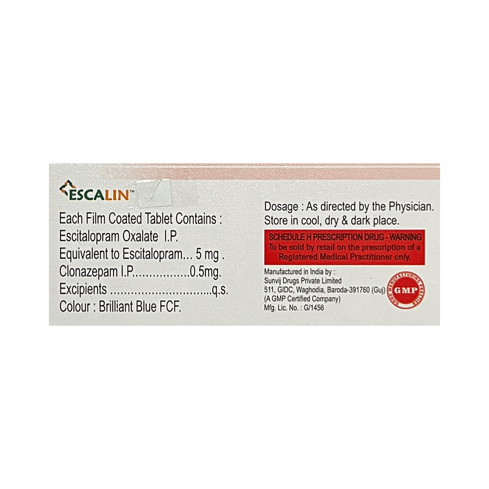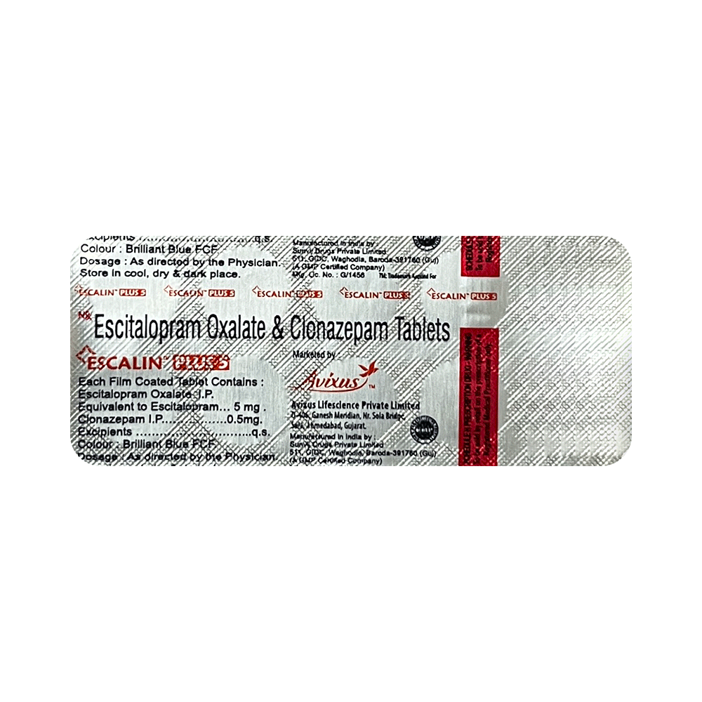 Escalin Plus 5 Tablet is a prescription medicine used to treat anxiety disorder. It is the combination medicine that calms the brain by decreasing the abnormal and excessive activity of the nerve cells. It also works by increasing the level of a chemical messenger in the brain which improves mood. Escalin Plus 5 Tablet can be taken with or without food. However, it is advised to take it at the same time each day as this helps to maintain a consistent level of medicine in the body. Take this medicine in the dose and duration advised by your doctor as it has habit-forming potential. If you miss a dose of this medicine, take it as soon as you remember. Finish the full course of treatment even if you feel better. It is important not to stop taking this medicine suddenly as it may cause withdrawal symptoms.Some common side effects of this medicine include delayed ejaculation, low sexual desire, vomiting, memory impairment, depression, and confusion. It may also cause dizziness and sleepiness. So, do not drive or do anything that requires mental focus until you know how this medicine affects you. It may cause weight gain or weight loss depending upon person to person. To prevent weight gain, you can eat a balanced diet and exercise regularly. On the other hand, weight loss can be prevented by increasing food portions in your diet. It is important to inform your doctor if you develop any unusual changes in mood as it can cause suicidal thoughts.Take caution while taking medicine if you are suffering from liver disease. Your doctor should also know about all other medicines you are taking as many of these may make this medicine less effective or change the way it works. Inform your doctor if you are pregnant, planning pregnancy or breastfeeding.