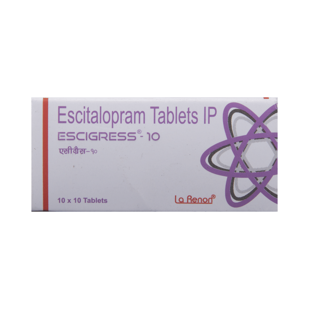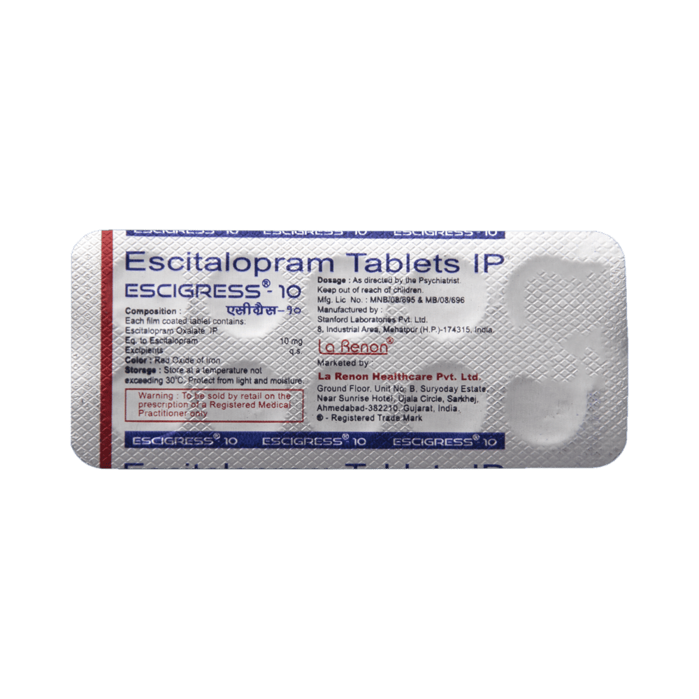ESCIgress 10 Tablet is a selective serotonin reuptake inhibitor (SSRI) antidepressant. It works by increasing the levels of serotonin, a chemical messenger in the brain. This improves mood and physical symptoms of depression and also relieves symptoms of anxiety, panic attacks and obsessive-compulsive disorders.