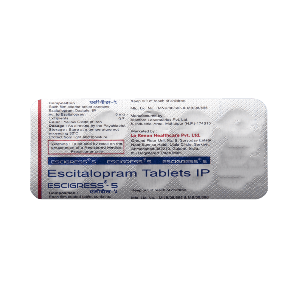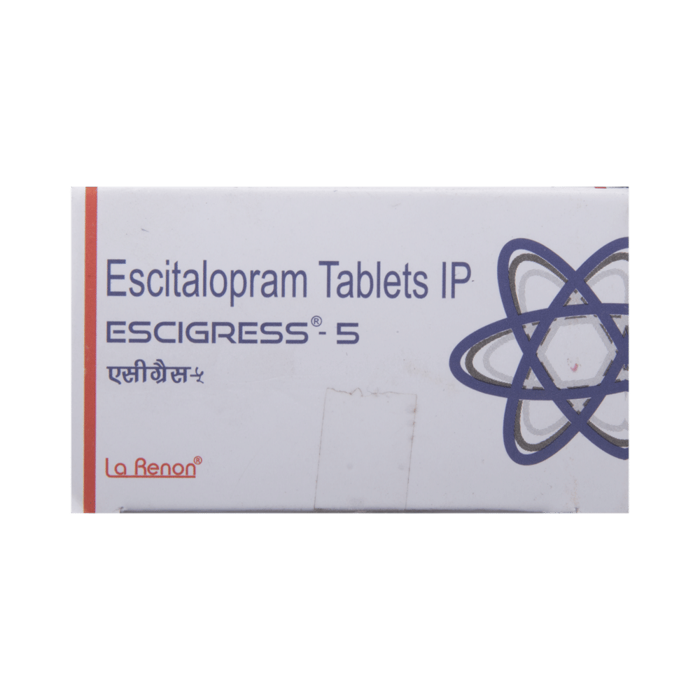 ESCIgress 5 Tablet is a selective serotonin reuptake inhibitor (SSRI) antidepressant. It works by increasing the levels of serotonin, a chemical messenger in the brain. This improves mood and physical symptoms of depression and also relieves symptoms of anxiety, panic attacks and obsessive-compulsive disorders.