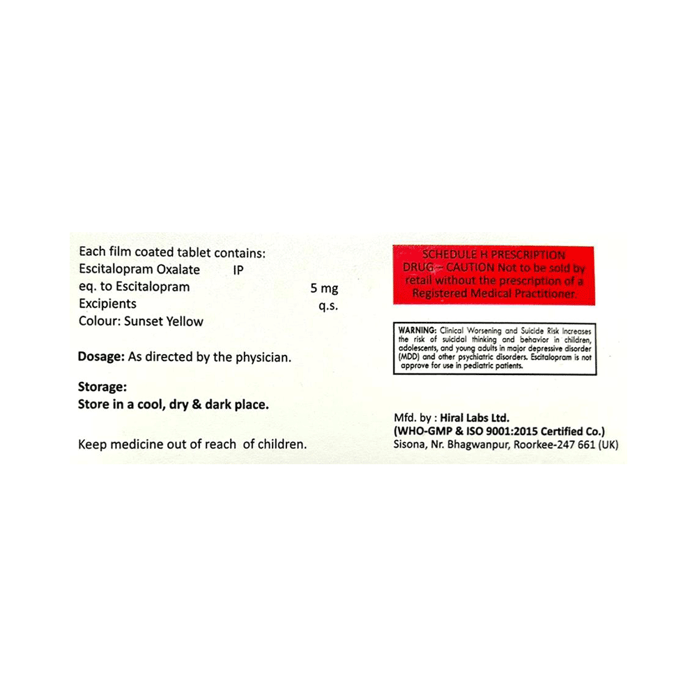 Escimet 5 Tablet is widely prescribed to treat depression and other mental health conditions like anxiety, panic disorder, and obsessive-compulsive disorder. It is a type of antidepressant known as a selective serotonin reuptake inhibitor (SSRI). Escimet 5 Tablet helps recover from depression by improving mood and relieving anxiety and tension. It can be taken with or without food. The dose and how often you need it will be decided by your doctor based on the amount needed to control your symptoms. Your doctor may start you on a lower dose and increase it gradually. Do not change the dose or stop taking it without talking to your doctor, even if you feel well. Doing so may make your condition worse or you may suffer from unpleasant withdrawal symptoms such as anxiety, restlessness, palpitations, dizziness, sleep disturbances.To get the most benefit, take this medicine regularly at the same time each day. Your doctor may advise you to take it in the morning if you have trouble sleeping. It may take a few weeks before you start feeling better. Let your doctor know if you do not see any improvement even after 4 weeks.Some common side effects of this medicine include nausea, fatigue, increased sweating, insomnia (difficulty in sleeping), decreased sexual drive, delayed ejaculation, and women may experience difficulties achieving orgasm. Some people may experience sleepiness after taking this medicine. Let your doctor know straight away if you develop any sudden worsening of mood or any thoughts about harming yourself.Before taking Escimet 5 Tablet, you should tell your doctor if you have epilepsy (seizure disorder or fits), diabetes, liver or kidney disease, any heart problems, or are currently taking medicines for depression known as MAO inhibitors. These may affect your treatment. Please tell your doctor about all the medicines you are taking to make sure you are safe.