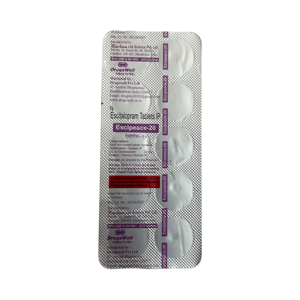 Escipeace 20 Tablet is widely prescribed to treat depression and other mental health conditions like anxiety, panic disorder, and obsessive-compulsive disorder. It is a type of antidepressant known as a selective serotonin reuptake inhibitor (SSRI). Escipeace 20 Tablet helps recover from depression by improving mood and relieving anxiety and tension. It can be taken with or without food. The dose and how often you need it will be decided by your doctor based on the amount needed to control your symptoms. Your doctor may start you on a lower dose and increase it gradually. Do not change the dose or stop taking it without talking to your doctor, even if you feel well. Doing so may make your condition worse or you may suffer from unpleasant withdrawal symptoms such as anxiety, restlessness, palpitations, dizziness, sleep disturbances.To get the most benefit, take this medicine regularly at the same time each day. Your doctor may advise you to take it in the morning if you have trouble sleeping. It may take a few weeks before you start feeling better. Let your doctor know if you do not see any improvement even after 4 weeks.Some common side effects of this medicine include nausea, fatigue, increased sweating, insomnia (difficulty in sleeping), decreased sexual drive, delayed ejaculation, and women may experience difficulties achieving orgasm. Some people may experience sleepiness after taking this medicine. Let your doctor know straight away if you develop any sudden worsening of mood or any thoughts about harming yourself.Before taking Escipeace 20 Tablet, you should tell your doctor if you have epilepsy (seizure disorder or fits), diabetes, liver or kidney disease, any heart problems, or are currently taking medicines for depression known as MAO inhibitors. These may affect your treatment. Please tell your doctor about all the medicines you are taking to make sure you are safe.