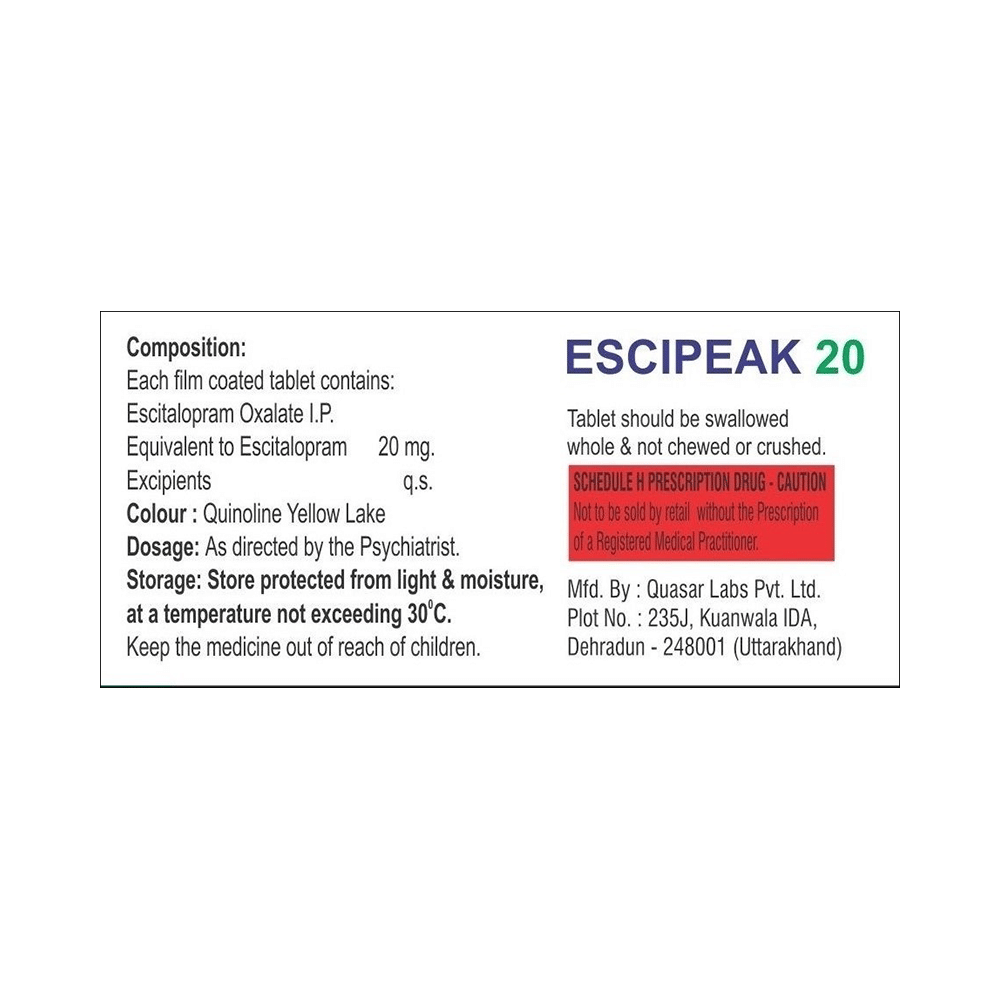 Escipeak 20 Tablet is widely prescribed to treat depression and other mental health conditions like anxiety, panic disorder, and obsessive-compulsive disorder. It is a type of antidepressant known as a selective serotonin reuptake inhibitor (SSRI). Escipeak 20 Tablet helps recover from depression by improving mood and relieving anxiety and tension. It can be taken with or without food. The dose and how often you need it will be decided by your doctor based on the amount needed to control your symptoms. Your doctor may start you on a lower dose and increase it gradually. Do not change the dose or stop taking it without talking to your doctor, even if you feel well. Doing so may make your condition worse or you may suffer from unpleasant withdrawal symptoms such as anxiety, restlessness, palpitations, dizziness, sleep disturbances.To get the most benefit, take this medicine regularly at the same time each day. Your doctor may advise you to take it in the morning if you have trouble sleeping. It may take a few weeks before you start feeling better. Let your doctor know if you do not see any improvement even after 4 weeks.Some common side effects of this medicine include nausea, fatigue, increased sweating, insomnia (difficulty in sleeping), decreased sexual drive, delayed ejaculation, and women may experience difficulties achieving orgasm. Some people may experience sleepiness after taking this medicine. Let your doctor know straight away if you develop any sudden worsening of mood or any thoughts about harming yourself.Before taking Escipeak 20 Tablet, you should tell your doctor if you have epilepsy (seizure disorder or fits), diabetes, liver or kidney disease, any heart problems, or are currently taking medicines for depression known as MAO inhibitors. These may affect your treatment. Please tell your doctor about all the medicines you are taking to make sure you are safe.