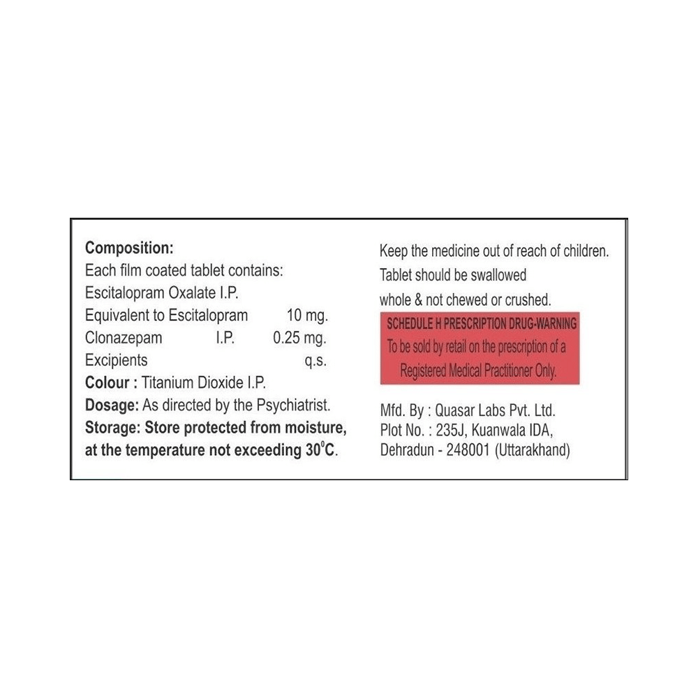 Salt Composition: Clonazepam (0.25mg) + Escitalopram Oxalate (10mg)