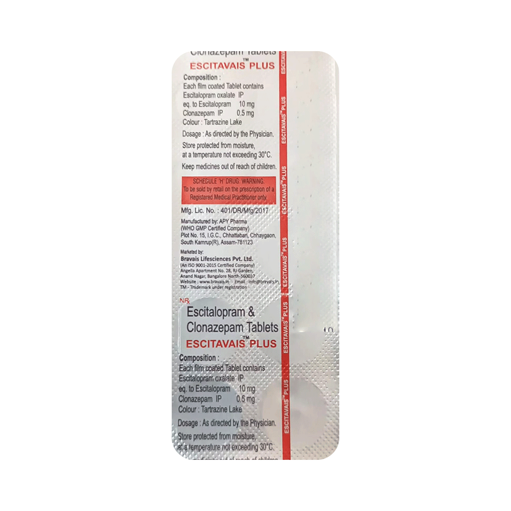 Escitavais Plus Tablet is a prescription medicine used to treat anxiety disorder. It is the combination medicine that calms the brain by decreasing the abnormal and excessive activity of the nerve cells. It also works by increasing the level of a chemical messenger in the brain which improves mood. Escitavais Plus Tablet can be taken with or without food. However, it is advised to take it at the same time each day as this helps to maintain a consistent level of medicine in the body. Take this medicine in the dose and duration advised by your doctor as it has habit-forming potential. If you miss a dose of this medicine, take it as soon as you remember. Finish the full course of treatment even if you feel better. It is important not to stop taking this medicine suddenly as it may cause withdrawal symptoms.Some common side effects of this medicine include delayed ejaculation, low sexual desire, vomiting, memory impairment, depression, and confusion. It may also cause dizziness and sleepiness. So, do not drive or do anything that requires mental focus until you know how this medicine affects you. It may cause weight gain or weight loss depending upon person to person. To prevent weight gain, you can eat a balanced diet and exercise regularly. On the other hand, weight loss can be prevented by increasing food portions in your diet. It is important to inform your doctor if you develop any unusual changes in mood as it can cause suicidal thoughts.Take caution while taking medicine if you are suffering from liver disease. Your doctor should also know about all other medicines you are taking as many of these may make this medicine less effective or change the way it works. Inform your doctor if you are pregnant, planning pregnancy or breastfeeding.