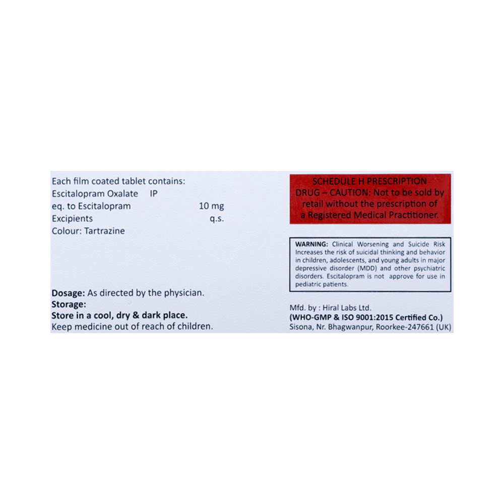 Escivia 10 Tablet is widely prescribed to treat depression and other mental health conditions like anxiety, panic disorder, and obsessive-compulsive disorder. It is a type of antidepressant known as a selective serotonin reuptake inhibitor (SSRI). Escivia 10 Tablet helps recover from depression by improving mood and relieving anxiety and tension. It can be taken with or without food. The dose and how often you need it will be decided by your doctor based on the amount needed to control your symptoms. Your doctor may start you on a lower dose and increase it gradually. Do not change the dose or stop taking it without talking to your doctor, even if you feel well. Doing so may make your condition worse or you may suffer from unpleasant withdrawal symptoms such as anxiety, restlessness, palpitations, dizziness, sleep disturbances.To get the most benefit, take this medicine regularly at the same time each day. Your doctor may advise you to take it in the morning if you have trouble sleeping. It may take a few weeks before you start feeling better. Let your doctor know if you do not see any improvement even after 4 weeks.Some common side effects of this medicine include nausea, fatigue, increased sweating, insomnia (difficulty in sleeping), decreased sexual drive, delayed ejaculation, and women may experience difficulties achieving orgasm. Some people may experience sleepiness after taking this medicine. Let your doctor know straight away if you develop any sudden worsening of mood or any thoughts about harming yourself.Before taking Escivia 10 Tablet, you should tell your doctor if you have epilepsy (seizure disorder or fits), diabetes, liver or kidney disease, any heart problems, or are currently taking medicines for depression known as MAO inhibitors. These may affect your treatment. Please tell your doctor about all the medicines you are taking to make sure you are safe.