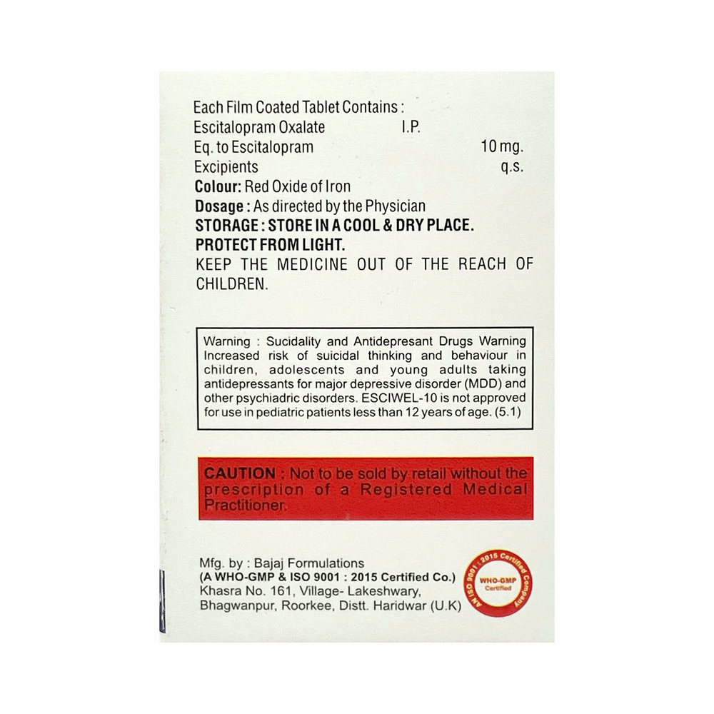 Esciwel 10 Tablet is widely prescribed to treat depression and other mental health conditions like anxiety, panic disorder, and obsessive-compulsive disorder. It is a type of antidepressant known as a selective serotonin reuptake inhibitor (SSRI). Esciwel 10 Tablet helps recover from depression by improving mood and relieving anxiety and tension. It can be taken with or without food. The dose and how often you need it will be decided by your doctor based on the amount needed to control your symptoms. Your doctor may start you on a lower dose and increase it gradually. Do not change the dose or stop taking it without talking to your doctor, even if you feel well. Doing so may make your condition worse or you may suffer from unpleasant withdrawal symptoms such as anxiety, restlessness, palpitations, dizziness, sleep disturbances.To get the most benefit, take this medicine regularly at the same time each day. Your doctor may advise you to take it in the morning if you have trouble sleeping. It may take a few weeks before you start feeling better. Let your doctor know if you do not see any improvement even after 4 weeks.Some common side effects of this medicine include nausea, fatigue, increased sweating, insomnia (difficulty in sleeping), decreased sexual drive, delayed ejaculation, and women may experience difficulties achieving orgasm. Some people may experience sleepiness after taking this medicine. Let your doctor know straight away if you develop any sudden worsening of mood or any thoughts about harming yourself.Before taking Esciwel 10 Tablet, you should tell your doctor if you have epilepsy (seizure disorder or fits), diabetes, liver or kidney disease, any heart problems, or are currently taking medicines for depression known as MAO inhibitors. These may affect your treatment. Please tell your doctor about all the medicines you are taking to make sure you are safe.