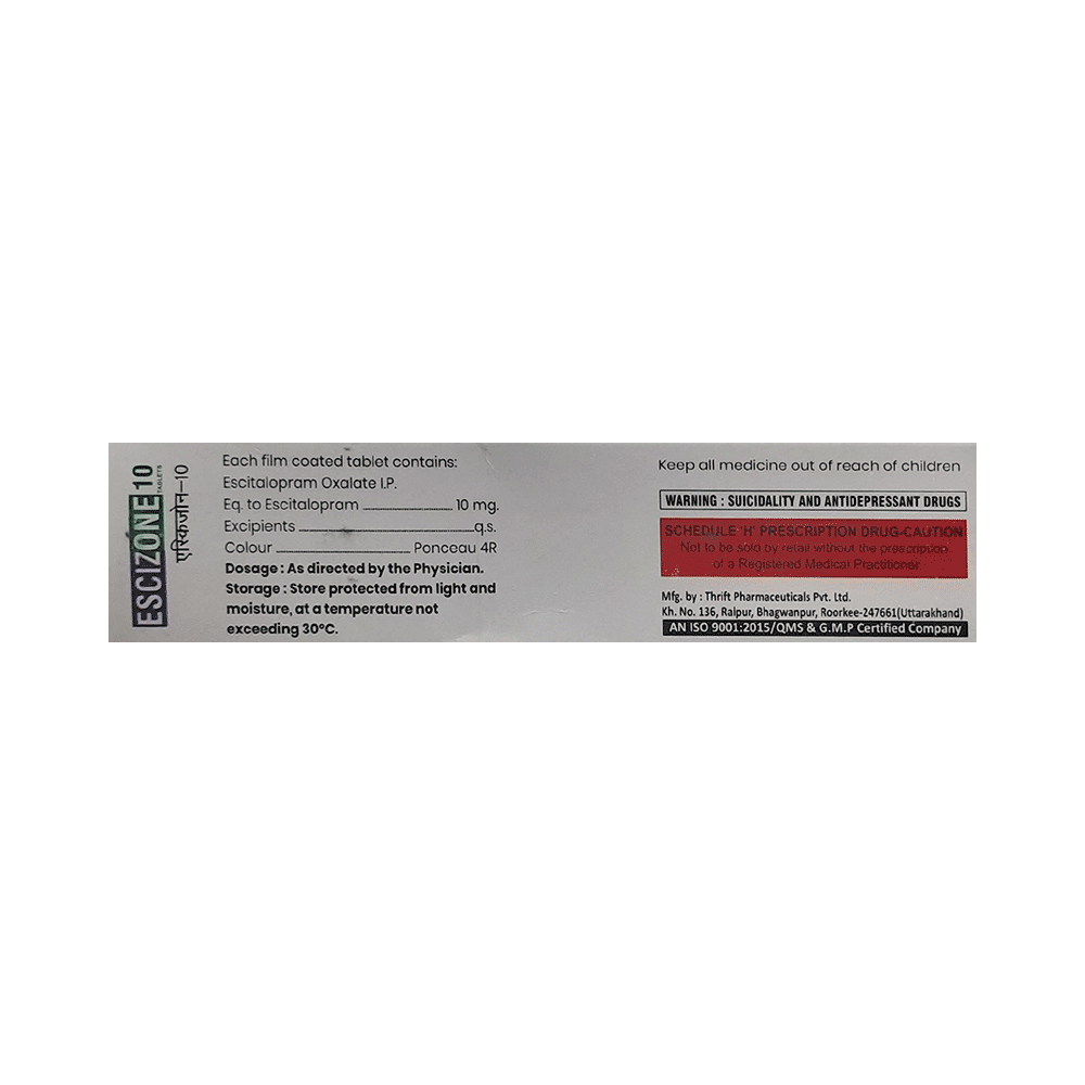 Escizone 10 Tablet is widely prescribed to treat depression and other mental health conditions like anxiety, panic disorder, and obsessive-compulsive disorder. It is a type of antidepressant known as a selective serotonin reuptake inhibitor (SSRI). Escizone 10 Tablet helps recover from depression by improving mood and relieving anxiety and tension. It can be taken with or without food. The dose and how often you need it will be decided by your doctor based on the amount needed to control your symptoms. Your doctor may start you on a lower dose and increase it gradually. Do not change the dose or stop taking it without talking to your doctor, even if you feel well. Doing so may make your condition worse or you may suffer from unpleasant withdrawal symptoms such as anxiety, restlessness, palpitations, dizziness, sleep disturbances.To get the most benefit, take this medicine regularly at the same time each day. Your doctor may advise you to take it in the morning if you have trouble sleeping. It may take a few weeks before you start feeling better. Let your doctor know if you do not see any improvement even after 4 weeks.Some common side effects of this medicine include nausea, fatigue, increased sweating, insomnia (difficulty in sleeping), decreased sexual drive, delayed ejaculation, and women may experience difficulties achieving orgasm. Some people may experience sleepiness after taking this medicine. Let your doctor know straight away if you develop any sudden worsening of mood or any thoughts about harming yourself.Before taking Escizone 10 Tablet, you should tell your doctor if you have epilepsy (seizure disorder or fits), diabetes, liver or kidney disease, any heart problems, or are currently taking medicines for depression known as MAO inhibitors. These may affect your treatment. Please tell your doctor about all the medicines you are taking to make sure you are safe.