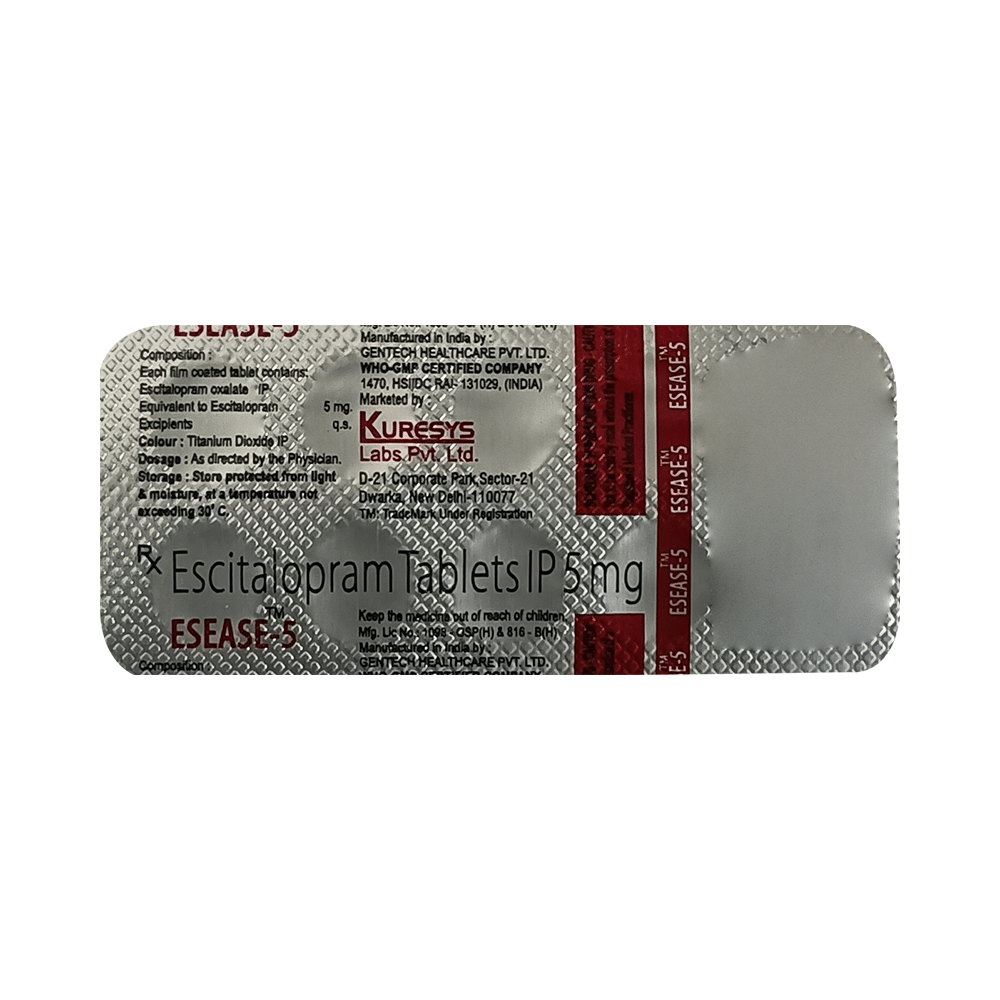 Esease 5 Tablet is widely prescribed to treat depression and other mental health conditions like anxiety, panic disorder, and obsessive-compulsive disorder. It is a type of antidepressant known as a selective serotonin reuptake inhibitor (SSRI). Esease 5 Tablet helps recover from depression by improving mood and relieving anxiety and tension. It can be taken with or without food. The dose and how often you need it will be decided by your doctor based on the amount needed to control your symptoms. Your doctor may start you on a lower dose and increase it gradually. Do not change the dose or stop taking it without talking to your doctor, even if you feel well. Doing so may make your condition worse or you may suffer from unpleasant withdrawal symptoms such as anxiety, restlessness, palpitations, dizziness, sleep disturbances.To get the most benefit, take this medicine regularly at the same time each day. Your doctor may advise you to take it in the morning if you have trouble sleeping. It may take a few weeks before you start feeling better. Let your doctor know if you do not see any improvement even after 4 weeks.Some common side effects of this medicine include nausea, fatigue, increased sweating, insomnia (difficulty in sleeping), decreased sexual drive, delayed ejaculation, and women may experience difficulties achieving orgasm. Some people may experience sleepiness after taking this medicine. Let your doctor know straight away if you develop any sudden worsening of mood or any thoughts about harming yourself.Before taking Esease 5 Tablet, you should tell your doctor if you have epilepsy (seizure disorder or fits), diabetes, liver or kidney disease, any heart problems, or are currently taking medicines for depression known as MAO inhibitors. These may affect your treatment. Please tell your doctor about all the medicines you are taking to make sure you are safe.