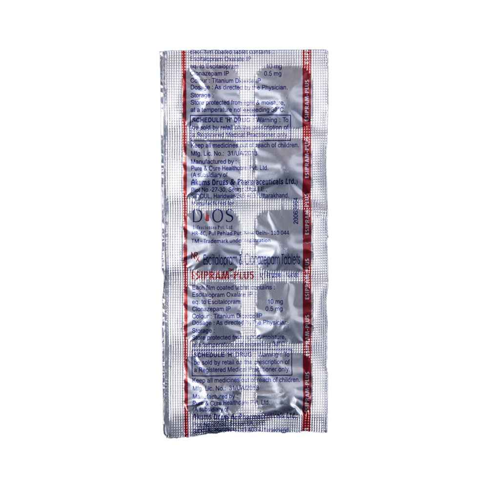 Esipram Plus Tablet is a prescription medicine used to treat anxiety disorder. It is the combination medicine that calms the brain by decreasing the abnormal and excessive activity of the nerve cells. It also works by increasing the level of a chemical messenger in the brain which improves mood. Esipram Plus Tablet can be taken with or without food. However, it is advised to take it at the same time each day as this helps to maintain a consistent level of medicine in the body. Take this medicine in the dose and duration advised by your doctor as it has habit-forming potential. If you miss a dose of this medicine, take it as soon as you remember. Finish the full course of treatment even if you feel better. It is important not to stop taking this medicine suddenly as it may cause withdrawal symptoms.Some common side effects of this medicine include delayed ejaculation, low sexual desire, vomiting, memory impairment, depression, and confusion. It may also cause dizziness and sleepiness. So, do not drive or do anything that requires mental focus until you know how this medicine affects you. It may cause weight gain or weight loss depending upon person to person. To prevent weight gain, you can eat a balanced diet and exercise regularly. On the other hand, weight loss can be prevented by increasing food portions in your diet. It is important to inform your doctor if you develop any unusual changes in mood as it can cause suicidal thoughts.Take caution while taking medicine if you are suffering from liver disease. Your doctor should also know about all other medicines you are taking as many of these may make this medicine less effective or change the way it works. Inform your doctor if you are pregnant, planning pregnancy or breastfeeding.