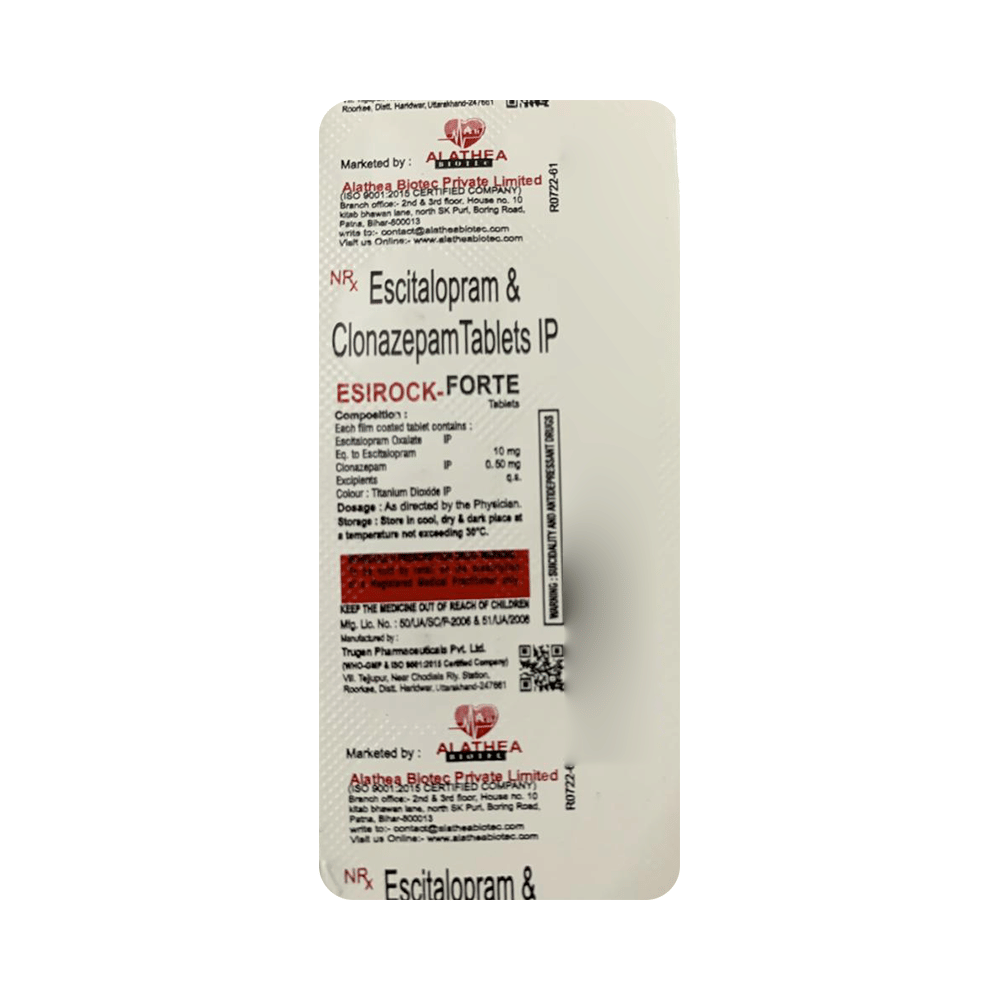 Esirock-Forte Tablet is a prescription medicine used to treat anxiety disorder. It is the combination medicine that calms the brain by decreasing the abnormal and excessive activity of the nerve cells. It also works by increasing the level of a chemical messenger in the brain which improves mood. Esirock-Forte Tablet can be taken with or without food. However, it is advised to take it at the same time each day as this helps to maintain a consistent level of medicine in the body. Take this medicine in the dose and duration advised by your doctor as it has habit-forming potential. If you miss a dose of this medicine, take it as soon as you remember. Finish the full course of treatment even if you feel better. It is important not to stop taking this medicine suddenly as it may cause withdrawal symptoms.Some common side effects of this medicine include delayed ejaculation, low sexual desire, vomiting, memory impairment, depression, and confusion. It may also cause dizziness and sleepiness. So, do not drive or do anything that requires mental focus until you know how this medicine affects you. It may cause weight gain or weight loss depending upon person to person. To prevent weight gain, you can eat a balanced diet and exercise regularly. On the other hand, weight loss can be prevented by increasing food portions in your diet. It is important to inform your doctor if you develop any unusual changes in mood as it can cause suicidal thoughts.Take caution while taking medicine if you are suffering from liver disease. Your doctor should also know about all other medicines you are taking as many of these may make this medicine less effective or change the way it works. Inform your doctor if you are pregnant, planning pregnancy or breastfeeding.