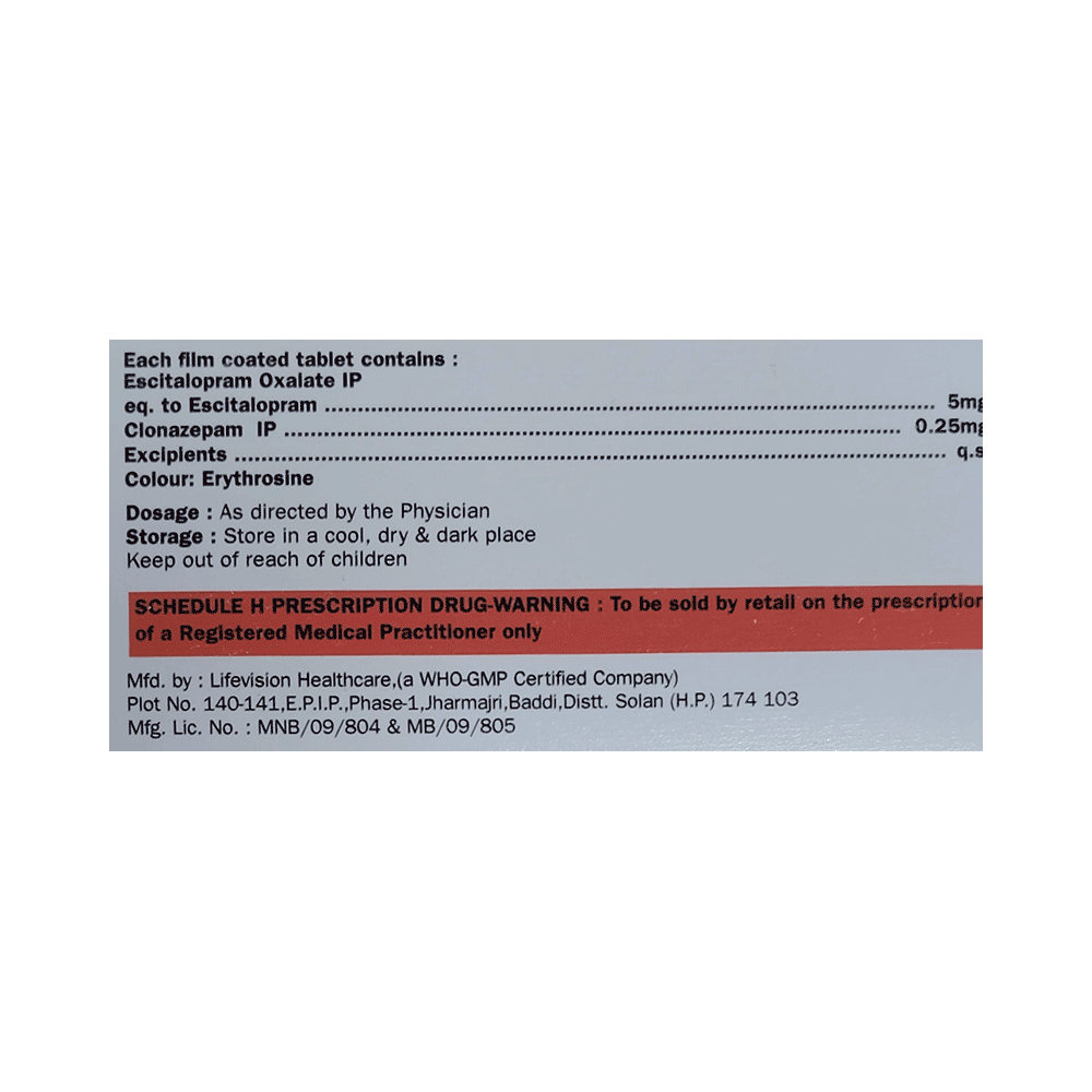 Salt Composition: Clonazepam (0.25mg) + Escitalopram Oxalate (5mg)