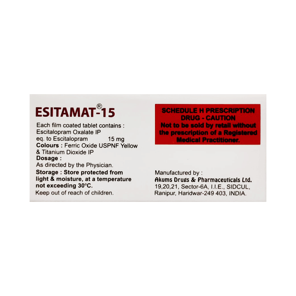 Esitamat 15 Tablet is a selective serotonin reuptake inhibitor (SSRI) antidepressant. It works by increasing the levels of serotonin, a chemical messenger in the brain. This improves mood and physical symptoms of depression and also relieves symptoms of anxiety, panic attacks and obsessive-compulsive disorders.
