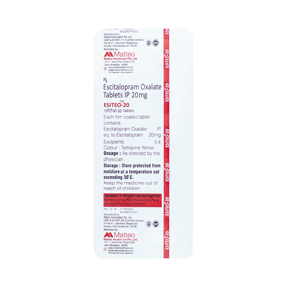 Esiteo 20 Tablet is widely prescribed to treat depression and other mental health conditions like anxiety, panic disorder, and obsessive-compulsive disorder. It is a type of antidepressant known as a selective serotonin reuptake inhibitor (SSRI). Esiteo 20 Tablet helps recover from depression by improving mood and relieving anxiety and tension. It can be taken with or without food. The dose and how often you need it will be decided by your doctor based on the amount needed to control your symptoms. Your doctor may start you on a lower dose and increase it gradually. Do not change the dose or stop taking it without talking to your doctor, even if you feel well. Doing so may make your condition worse or you may suffer from unpleasant withdrawal symptoms such as anxiety, restlessness, palpitations, dizziness, sleep disturbances.To get the most benefit, take this medicine regularly at the same time each day. Your doctor may advise you to take it in the morning if you have trouble sleeping. It may take a few weeks before you start feeling better. Let your doctor know if you do not see any improvement even after 4 weeks.Some common side effects of this medicine include nausea, fatigue, increased sweating, insomnia (difficulty in sleeping), decreased sexual drive, delayed ejaculation, and women may experience difficulties achieving orgasm. Some people may experience sleepiness after taking this medicine. Let your doctor know straight away if you develop any sudden worsening of mood or any thoughts about harming yourself.Before taking Esiteo 20 Tablet, you should tell your doctor if you have epilepsy (seizure disorder or fits), diabetes, liver or kidney disease, any heart problems, or are currently taking medicines for depression known as MAO inhibitors. These may affect your treatment. Please tell your doctor about all the medicines you are taking to make sure you are safe.