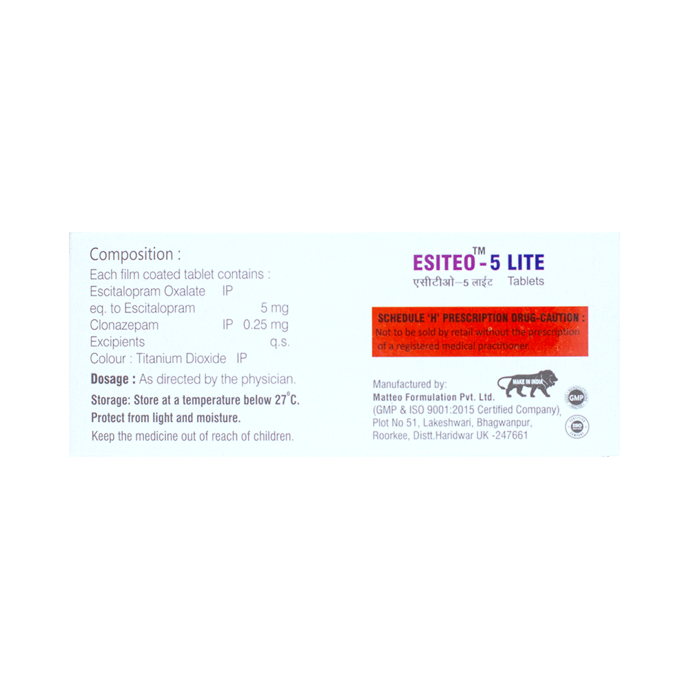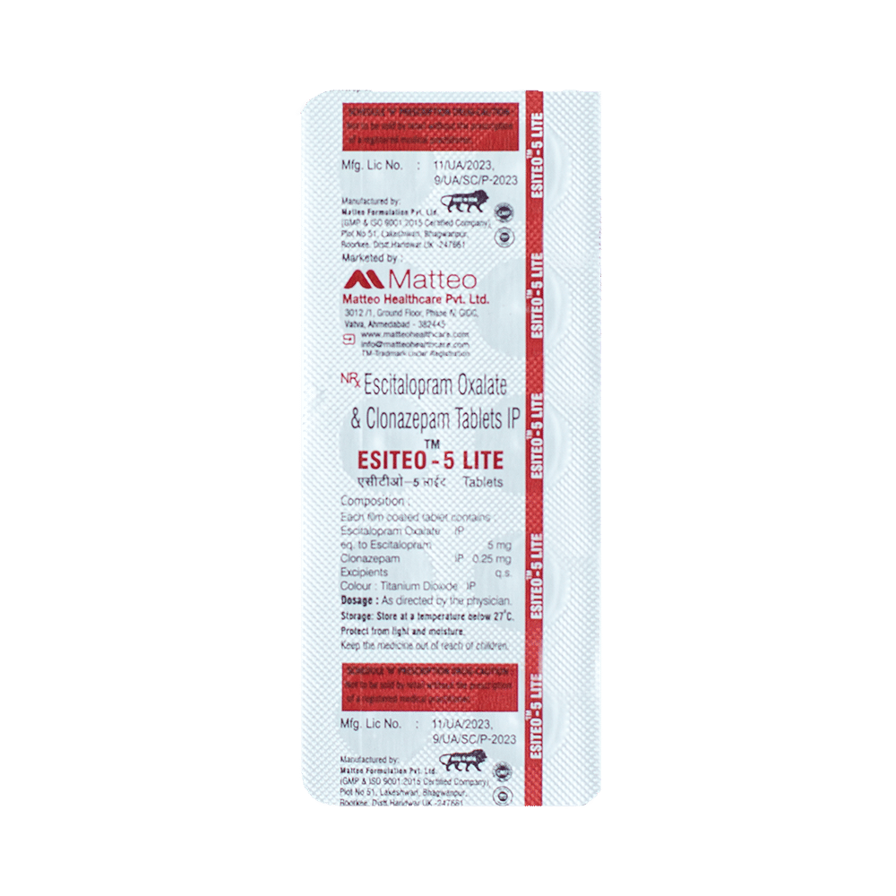 Esiteo 5 Lite Tablet is a prescription medicine used to treat anxiety disorder. It is the combination medicine that calms the brain by decreasing the abnormal and excessive activity of the nerve cells. It also works by increasing the level of a chemical messenger in the brain which improves mood. Esiteo 5 Lite Tablet can be taken with or without food. However, it is advised to take it at the same time each day as this helps to maintain a consistent level of medicine in the body. Take this medicine in the dose and duration advised by your doctor as it has habit-forming potential. If you miss a dose of this medicine, take it as soon as you remember. Finish the full course of treatment even if you feel better. It is important not to stop taking this medicine suddenly as it may cause withdrawal symptoms.Some common side effects of this medicine include delayed ejaculation, low sexual desire, vomiting, memory impairment, depression, and confusion. It may also cause dizziness and sleepiness. So, do not drive or do anything that requires mental focus until you know how this medicine affects you. It may cause weight gain or weight loss depending upon person to person. To prevent weight gain, you can eat a balanced diet and exercise regularly. On the other hand, weight loss can be prevented by increasing food portions in your diet. It is important to inform your doctor if you develop any unusual changes in mood as it can cause suicidal thoughts.Take caution while taking medicine if you are suffering from liver disease. Your doctor should also know about all other medicines you are taking as many of these may make this medicine less effective or change the way it works. Inform your doctor if you are pregnant, planning pregnancy or breastfeeding.