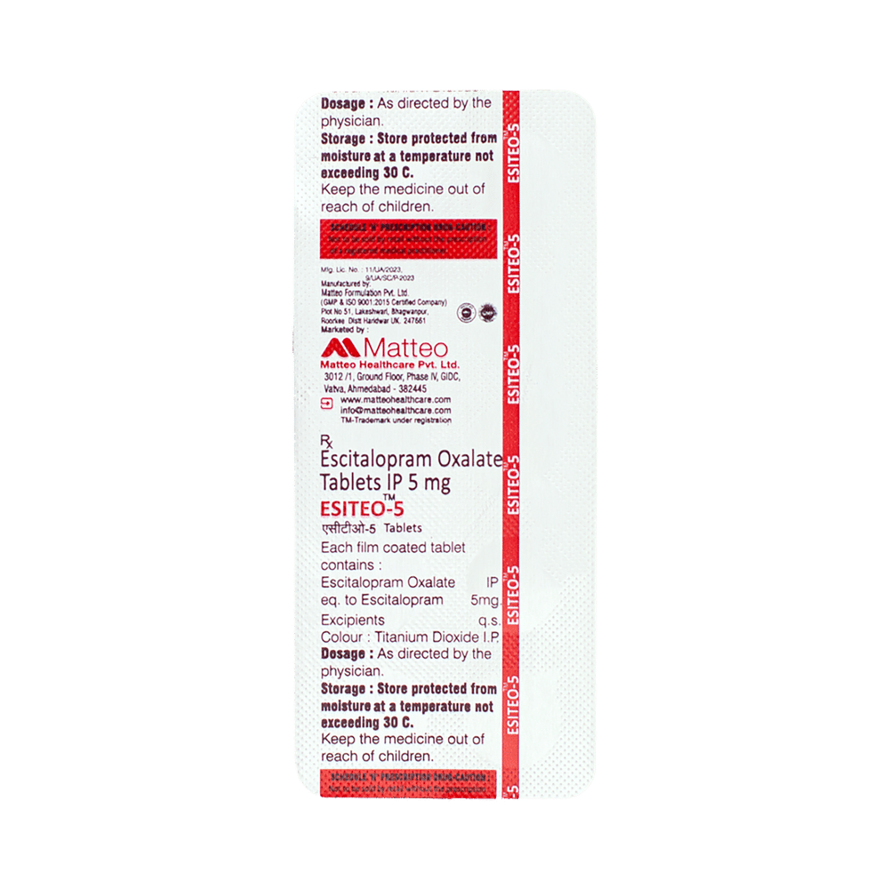 Esiteo 5 Tablet is a selective serotonin reuptake inhibitor (SSRI) antidepressant. It works by increasing the levels of serotonin, a chemical messenger in the brain. This improves mood and physical symptoms of depression and also relieves symptoms of anxiety, panic attacks and obsessive-compulsive disorders.