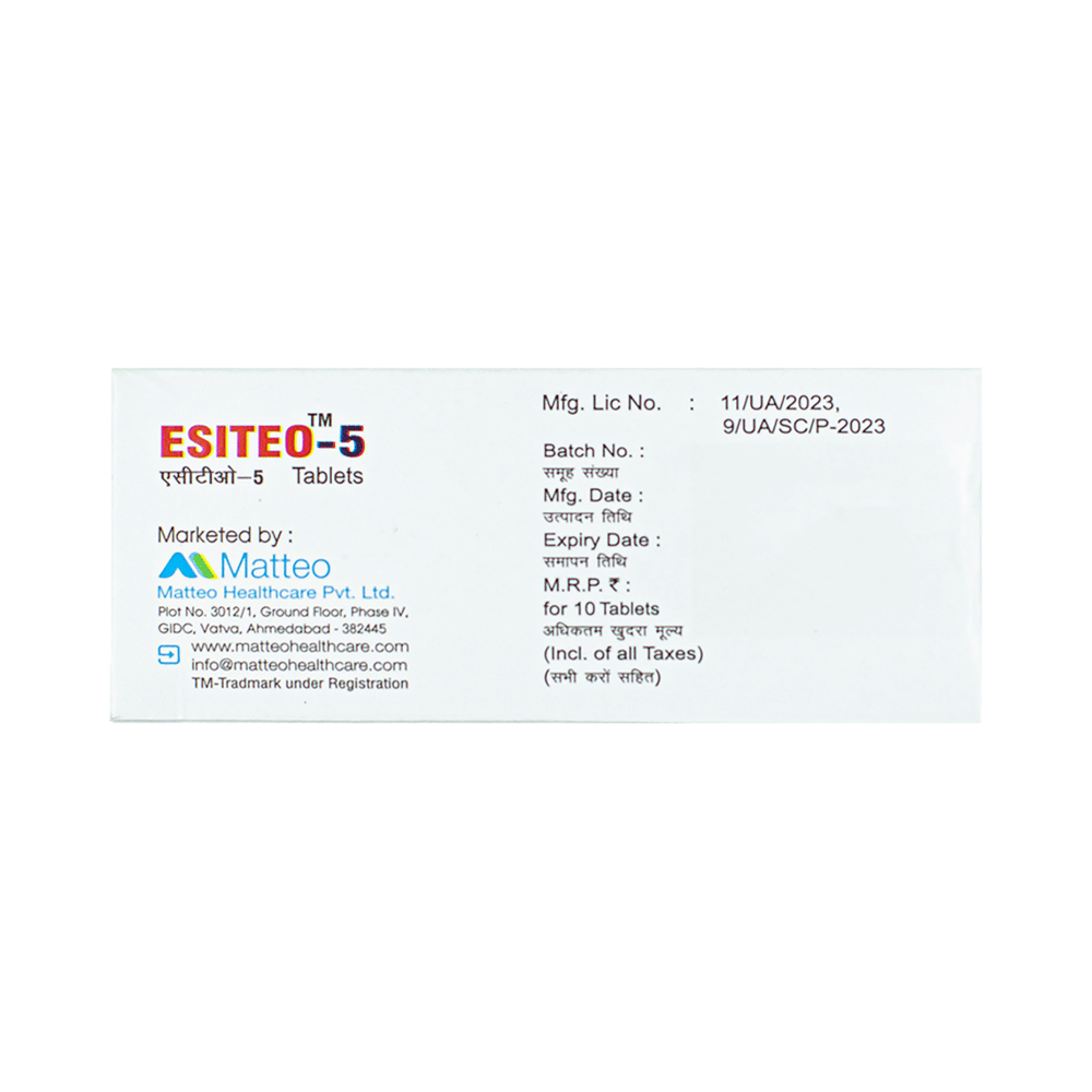 Take this medicine in the dose and duration as advised by your doctor. Swallow it as a whole. Do not chew, crush or break it. Esiteo 5 Tablet may be taken with or without food, but it is better to take it at a fixed time.