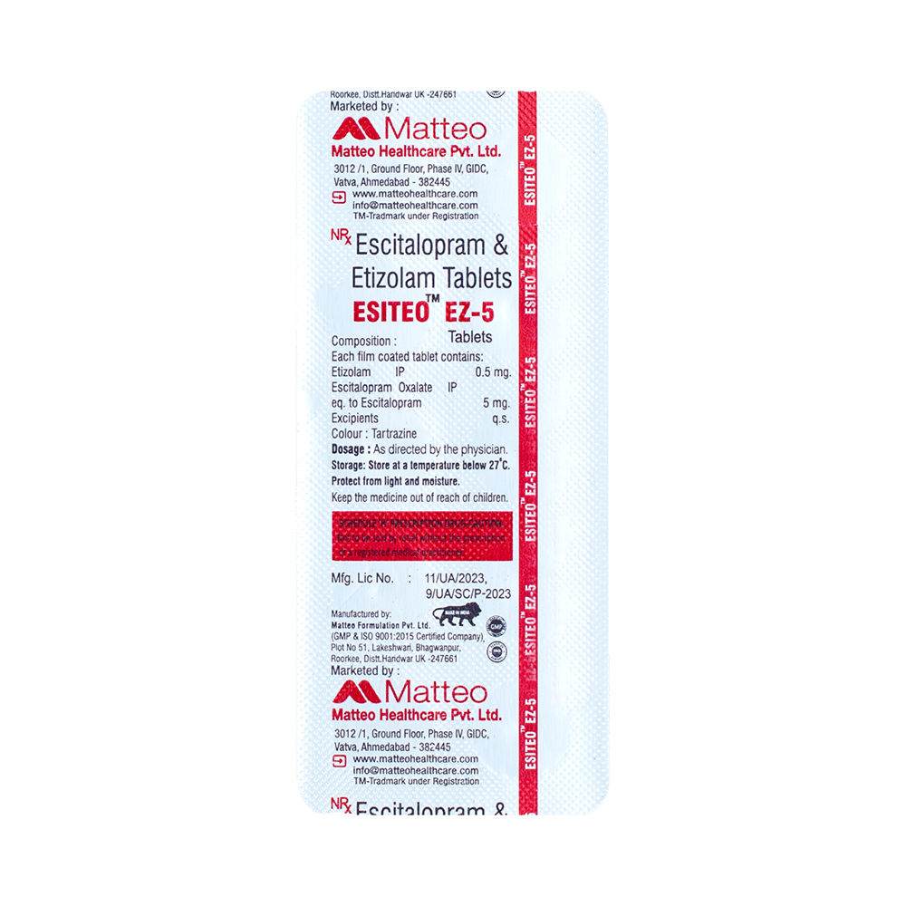 Esiteo EZ 5 Tablet is a prescription medicine used to treat depression. It is a combination medicine that calms the brain by decreasing the abnormal and excessive activity of the nerve cells. It also increases the level of chemical messenger in the brain which improves mood. Esiteo EZ 5 Tablet can be taken with or without food. However, it is advised to take it at the same time each day as this helps to maintain a consistent level of medicine in the body. Take this medicine in the dose and duration advised by your doctor as it has habit-forming potential. If you miss a dose of this medicine, take it as soon as you remember. Finish the full course of treatment even if you feel better. It is important not to stop taking this medicine suddenly as this may cause withdrawal symptoms.Some common side effects of this medicine include nausea, vomiting, diarrhea, confusion, memory impairment, low sexual desire, and delayed ejaculation. It may also cause dizziness and sleepiness. So, do not drive or do anything that requires mental focus until you know how this medicine affects you. Remember to inform your doctor if you develop any unusual changes in mood as it can cause suicidal thoughts and can be dangerous for you. This medicine may cause weight gain and to control it, you should have a balanced diet and exercise regularly.Take caution while taking medicine if you are suffering from liver disease. Your doctor should also know about all other medicines you are taking as many of these may make this medicine less effective or change the way it works. Inform your doctor if you are pregnant, planning pregnancy or breastfeeding.