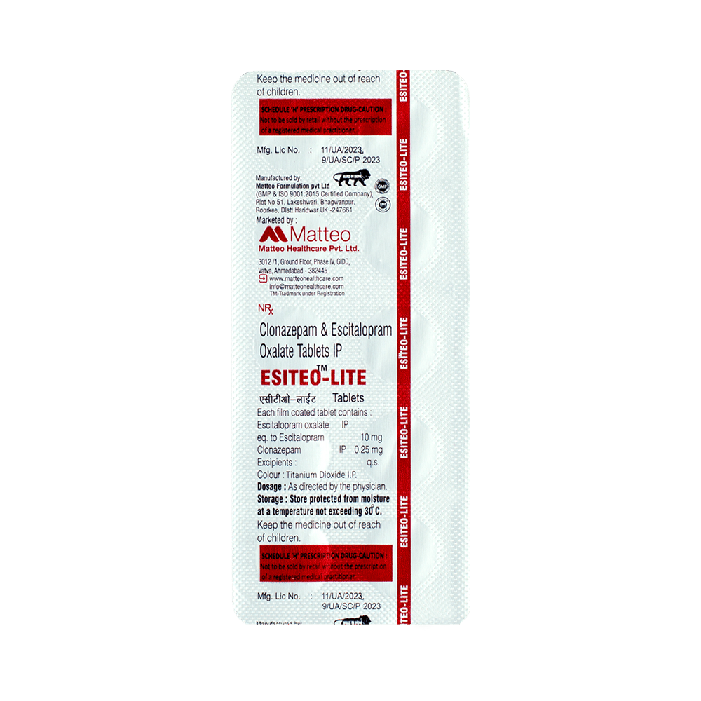 Esiteo-Lite Tablet is a prescription medicine used to treat anxiety disorder. It is the combination medicine that calms the brain by decreasing the abnormal and excessive activity of the nerve cells. It also works by increasing the level of a chemical messenger in the brain which improves mood. Esiteo-Lite Tablet can be taken with or without food. However, it is advised to take it at the same time each day as this helps to maintain a consistent level of medicine in the body. Take this medicine in the dose and duration advised by your doctor as it has habit-forming potential. If you miss a dose of this medicine, take it as soon as you remember. Finish the full course of treatment even if you feel better. It is important not to stop taking this medicine suddenly as it may cause withdrawal symptoms.Some common side effects of this medicine include delayed ejaculation, low sexual desire, vomiting, memory impairment, depression, and confusion. It may also cause dizziness and sleepiness. So, do not drive or do anything that requires mental focus until you know how this medicine affects you. It may cause weight gain or weight loss depending upon person to person. To prevent weight gain, you can eat a balanced diet and exercise regularly. On the other hand, weight loss can be prevented by increasing food portions in your diet. It is important to inform your doctor if you develop any unusual changes in mood as it can cause suicidal thoughts.Take caution while taking medicine if you are suffering from liver disease. Your doctor should also know about all other medicines you are taking as many of these may make this medicine less effective or change the way it works. Inform your doctor if you are pregnant, planning pregnancy or breastfeeding.