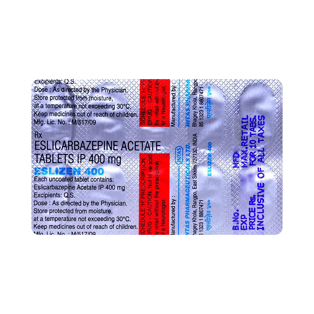 Eslizen 400mg Tablet is a prescription medicine used to treat epilepsy (seizures). It helps to decrease the abnormal and excessive activity of the nerve cells and calms the brain. Eslizen 400mg Tablet may be taken with or without food, preferably at the same time, each day. Take this medicine in the dose and duration as advised by your doctor. If you have missed a dose, take it as soon as you remember it. Do not skip any doses and finish the full course of treatment even if you feel better. Do not stop taking it abruptly without discussing it with your doctor, as it may increase seizure frequency.Some of the common side effects of this medicine include blurred or double vision, headache, nausea, vomiting, fatigue, rash, and diarrhea. It may also cause dizziness and sleepiness, do not drive or do anything that requires mental focus until you know how this medicine affects you. Please consult your doctor if these side effects bother you or do not go away.Your doctor may advice for regular monitoring of sodium levels, as it may reduce the sodium levels in your blood (hyponatremia). Inform your doctor if you are taking oral contraceptive pills as this medicine reduces their levels in the body.