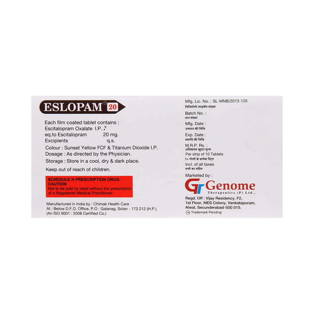 Eslopam 20mg Tablet is widely prescribed to treat depression and other mental health conditions like anxiety, panic disorder, and obsessive-compulsive disorder. It is a type of antidepressant known as a selective serotonin reuptake inhibitor (SSRI). Eslopam 20mg Tablet helps recover from depression by improving mood and relieving anxiety and tension. It can be taken with or without food. The dose and how often you need it will be decided by your doctor based on the amount needed to control your symptoms. Your doctor may start you on a lower dose and increase it gradually. Do not change the dose or stop taking it without talking to your doctor, even if you feel well. Doing so may make your condition worse or you may suffer from unpleasant withdrawal symptoms such as anxiety, restlessness, palpitations, dizziness, sleep disturbances.To get the most benefit, take this medicine regularly at the same time each day. Your doctor may advise you to take it in the morning if you have trouble sleeping. It may take a few weeks before you start feeling better. Let your doctor know if you do not see any improvement even after 4 weeks.Some common side effects of this medicine include nausea, fatigue, increased sweating, insomnia (difficulty in sleeping), decreased sexual drive, delayed ejaculation, and women may experience difficulties achieving orgasm. Some people may experience sleepiness after taking this medicine. Let your doctor know straight away if you develop any sudden worsening of mood or any thoughts about harming yourself.Before taking Eslopam 20mg Tablet, you should tell your doctor if you have epilepsy (seizure disorder or fits), diabetes, liver or kidney disease, any heart problems, or are currently taking medicines for depression known as MAO inhibitors. These may affect your treatment. Please tell your doctor about all the medicines you are taking to make sure you are safe.