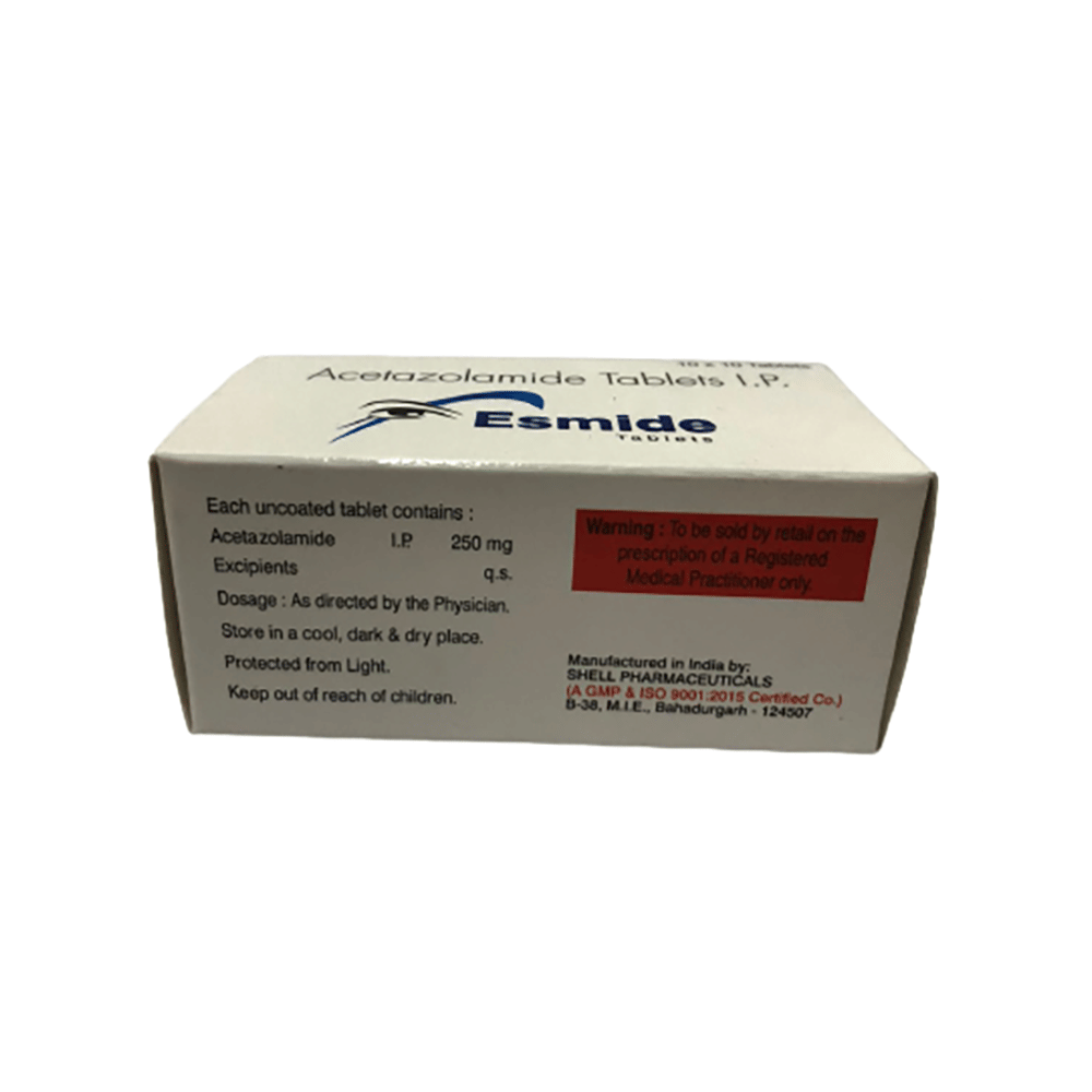 Esmide 250mg Tablet is a medicine used to reduce pressure in the eyes. This pressure can be caused by or lead to an illness called glaucoma. If the pressure in your eye is too high it can damage your sight. Esmide 250mg Tablet works by decreasing the amount of fluid inside the eye. You can take Esmide 250mg Tablet with or without food. The dose will depend on your condition and how you respond to the medicine. Try to take it at the same time each day. It is important to keep taking this medicine until your doctor tells you not to. Use this medicine regularly to get the most benefit from it even if you feel well.The most common side effect is headache. Other side effects include feeling tired, dizziness, and taste change. Make sure you read the leaflet that comes with your medicines and tell your doctor if you are bothered by side effects or they do not go away. It may be possible to adjust your dose or try a different medicine. It is also reported to cause choroidal effusion (fluid buildup between the choroid and sclera.) or choroidal detachment (separation of the choroid from the sclera due to fluid accumulation) in some people. If you experience such reactions, inform your doctor.Avoid using of this medicine if you have a known history of allergic reaction to any of the components of this medicine. Let your doctor also know about all the medicines you are taking to make sure it is safe for you. Additionally, let your doctor know if you have kidney or liver disease, heart trouble or diabetes before taking the medicine. Pregnant and breastfeeding women should consult their doctor before using this medicine as it may cause hamrful effects to the mother or the developing baby.