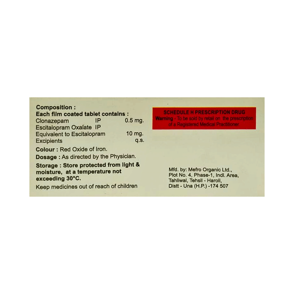 Salt Composition: Clonazepam (0.5mg) + Escitalopram Oxalate (10mg)