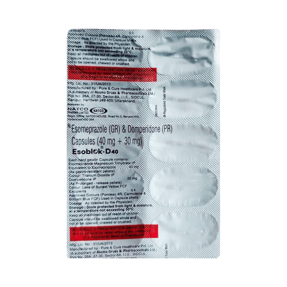 Esoblok D 30mg/40mg Capsule is a prescription medicine used to treat gastroesophageal reflux disease (acid reflux). It helps relieve symptoms such as heartburn, stomach pain, or irritation. It also neutralizes the acid in the stomach and promotes easy gas passage to reduce stomach discomfort. Esoblok D 30mg/40mg Capsule is best taken on an empty stomach. Take it in the dose and duration advised by the doctor. Continue taking this medicine for as long as your doctor recommends. If you stop treatment too early, your symptoms may come back, and your condition may worsen. Let your doctor know about all other medications you are taking, as some may affect, or be affected by, this medicine.The most common side effects of Esoblok D 30mg/40mg Capsule include diarrhea, flatulence, stomach pain, dryness in the mouth, and headache. Most of these are temporary and usually resolve with time. Contact your doctor straight away if you are at all concerned about any side effects. It may also cause sleepiness and dizziness, so do not drive or do anything that requires mental focus until you know how this medicine affects you.Before taking this medicine, you should tell your doctor if you are pregnant, planning pregnancy, or breastfeeding. You should also tell your doctor if you have severe liver disease so that your doctor can prescribe a suitable dose for you. Lifestyle modifications like having cold milk and avoiding hot tea, coffee, spicy food, or chocolate can help you get better results.