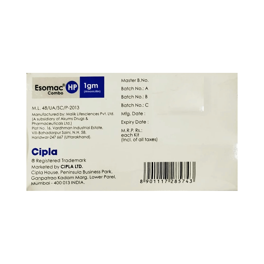 Esomac HP 750mg/500mg/40mg Combo Kit is a combination of two antibiotics and an antacid that effectively treats peptic ulcer disease caused due to H. pylori bacterial infection. It fights against the bacteria to treat the infection. It also relieves acidity and discomfort related to the infection. Esomac HP 750mg/500mg/40mg Combo Kit is a prescription medicine. It is advised to take it as per the prescription. It should be taken in an empty stomach, but it must be taken at a fixed time to ensure better efficacy. Do not consume more than the recommended dose, as this may have harmful effects on your body. If you miss a dose, take it as soon as you remember. The treatment must be completed even if you feel better.The common side effects of this medicine include nausea, vomiting, diarrhea, and rashes. If any of the side effects get aggravated, you must consult your doctor immediately. If you experience any allergic reaction (rashes, itching, swelling, shortness of breath, etc.), you must seek immediate medical help.Before taking this medicine, you should tell your doctor if you are taking any medicines for any health condition. Pregnant or breastfeeding women should also consult with their doctor before taking it. Avoid drinking alcohol as it can cause excessive drowsiness with this medicine. It usually does not impair your ability to drive, but you should not drive if it makes you feel sleepy or dizzy.
