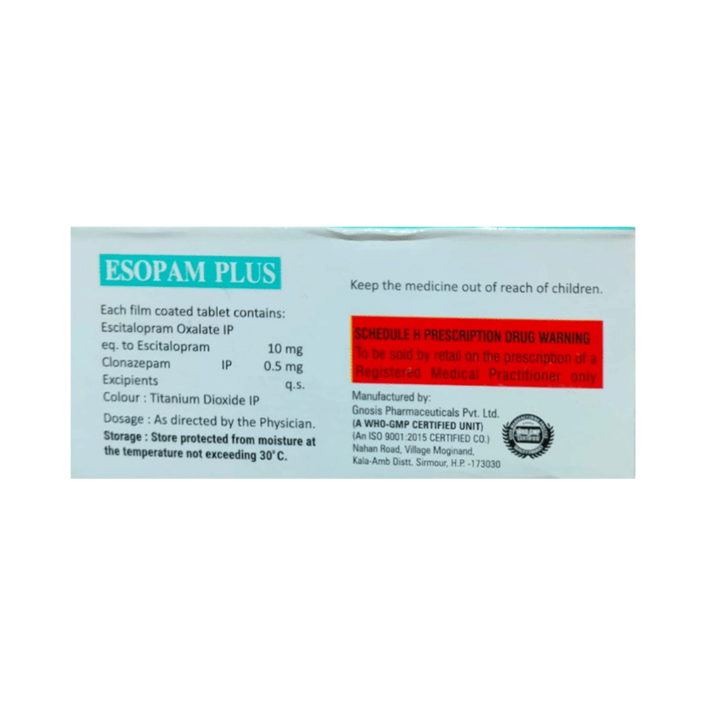 Esopam Plus Tablet is a prescription medicine used to treat anxiety disorder. It is the combination medicine that calms the brain by decreasing the abnormal and excessive activity of the nerve cells. It also works by increasing the level of a chemical messenger in the brain which improves mood. Esopam Plus Tablet can be taken with or without food. However, it is advised to take it at the same time each day as this helps to maintain a consistent level of medicine in the body. Take this medicine in the dose and duration advised by your doctor as it has habit-forming potential. If you miss a dose of this medicine, take it as soon as you remember. Finish the full course of treatment even if you feel better. It is important not to stop taking this medicine suddenly as it may cause withdrawal symptoms.Some common side effects of this medicine include delayed ejaculation, low sexual desire, vomiting, memory impairment, depression, and confusion. It may also cause dizziness and sleepiness. So, do not drive or do anything that requires mental focus until you know how this medicine affects you. It may cause weight gain or weight loss depending upon person to person. To prevent weight gain, you can eat a balanced diet and exercise regularly. On the other hand, weight loss can be prevented by increasing food portions in your diet. It is important to inform your doctor if you develop any unusual changes in mood as it can cause suicidal thoughts.Take caution while taking medicine if you are suffering from liver disease. Your doctor should also know about all other medicines you are taking as many of these may make this medicine less effective or change the way it works. Inform your doctor if you are pregnant, planning pregnancy or breastfeeding.