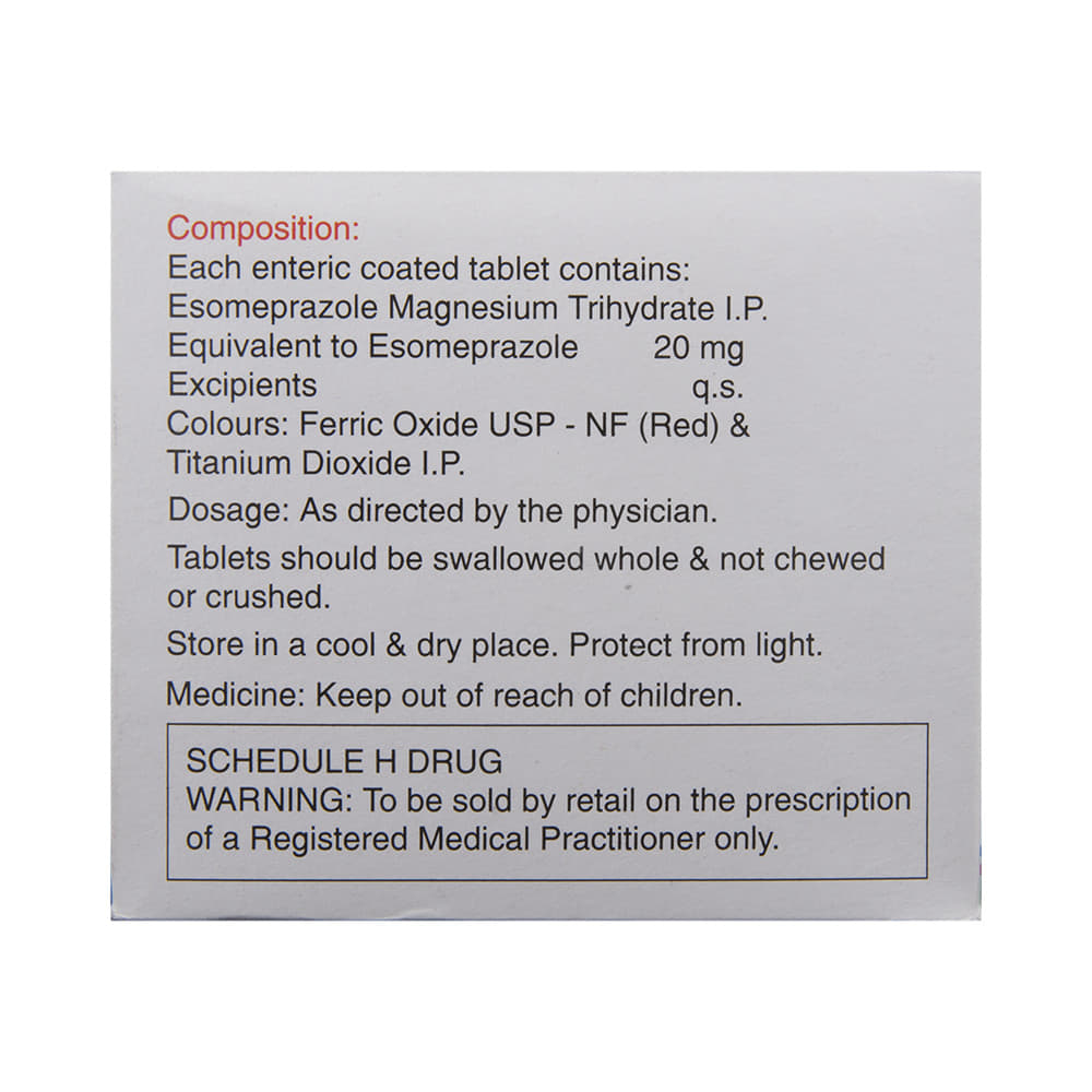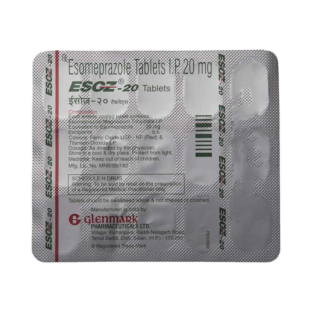 Esoz 20 Tablet is used to treat conditions related to excessive stomach acid production, such as gastroesophageal reflux disease (GERD), peptic ulcer disease, and Zollinger-Ellison syndrome. It reduces the amount of acid produced in the stomach and provides relief from symptoms and promotes healing. Esoz 20 Tablet can also be used to prevent stomach ulcers caused by certain medications, such as nonsteroidal anti-inflammatory drugs (NSAIDs). Take it in the exact dose and duration prescribed by your doctor. It is usually taken on an empty stomach, preferably in the morning or at least 1 hour before a meal. Continue taking the medicine even if your symptoms disappear until the doctor says it is okay to stop. If you are taking this medicine for a long time, your doctor may carry out regular tests to check your levels of magnesium which can fall with this medicine.Common side effects include headache, constipation or diarrhea, stomach pain, and nausea. These tend to be mild but talk to your doctor if they bother you or do not go away. The risk of side effects may increase the longer you take this medicine. You may be more likely to have a broken bone if you take it for a long time. It is best to avoid foods that seem to make your symptoms worse, such as rich, spicy, and fatty foods. Cutting down on caffeinated drinks, such as tea, coffee, and cola, as well as alcohol may also help.Esoz 20 Tablet may not be suitable for some people. Before taking this medicine, you need to tell your doctor if you have severe liver problems, are taking medicines for HIV, have had an allergic reaction to similar medicines in the past, or have osteoporosis. Alcohol does not interfere with the way Esoz 20 Tablet works; however, drinking alcohol makes your stomach produce more acid than normal. This medicine can make you feel dizzy, or sleepy, or affect your vision. If this happens, do not drive, cycle, or use machinery or tools until you feel better. This medicine is not usually recommended during pregnancy and breastfeeding.