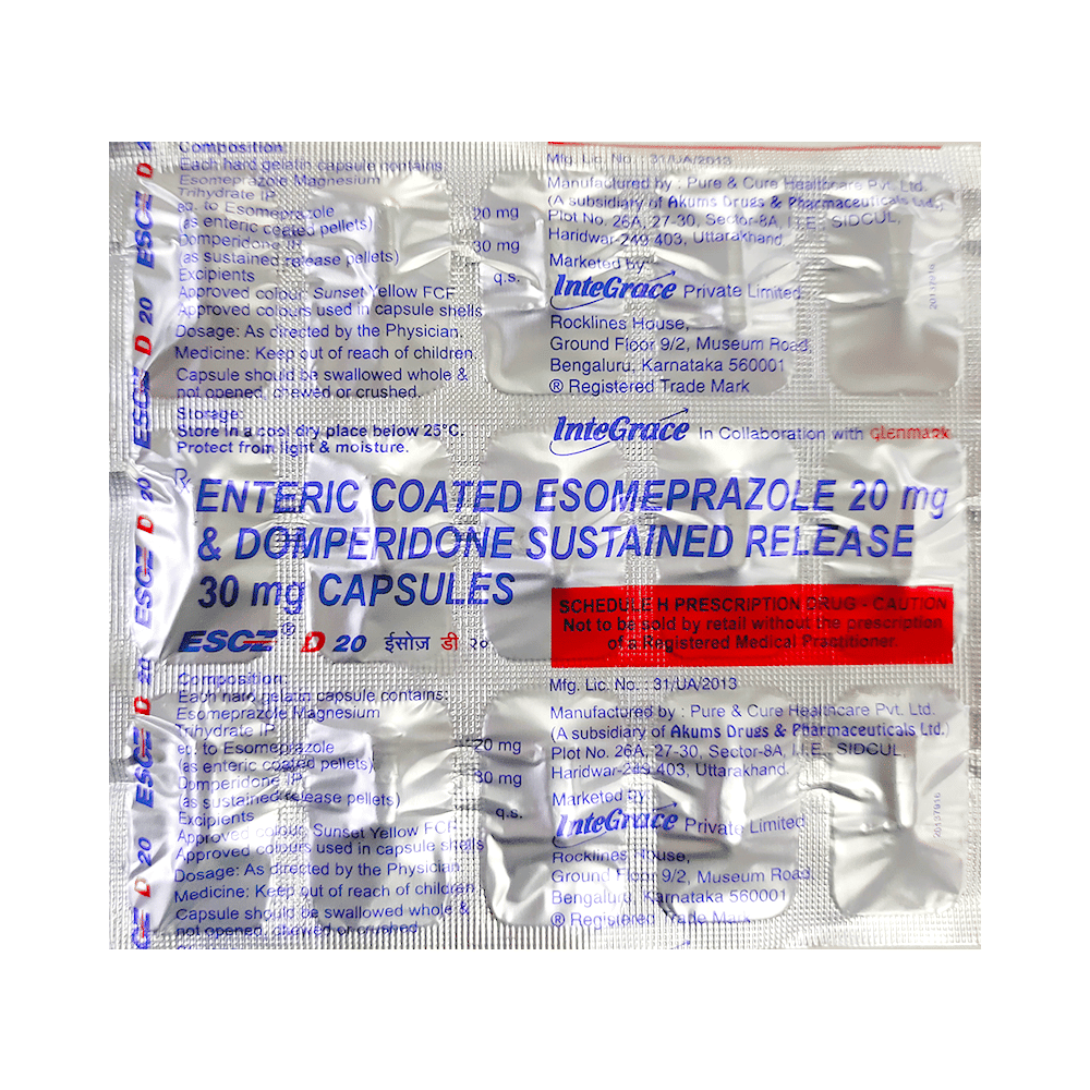 Esoz D 20 Capsule SR is a prescription medicine used to treat gastroesophageal reflux disease (acid reflux). It helps relieve symptoms such as heartburn, stomach pain, or irritation. It also neutralizes the acid in the stomach and promotes easy gas passage to reduce stomach discomfort. Esoz D 20 Capsule SR is best taken on an empty stomach. Take it in the dose and duration advised by the doctor. Continue taking this medicine for as long as your doctor recommends. If you stop treatment too early, your symptoms may come back, and your condition may worsen. Let your doctor know about all other medications you are taking, as some may affect, or be affected by, this medicine.The most common side effects of Esoz D 20 Capsule SR include diarrhea, flatulence, stomach pain, dryness in the mouth, and headache. Most of these are temporary and usually resolve with time. Contact your doctor straight away if you are at all concerned about any side effects. It may also cause sleepiness and dizziness, so do not drive or do anything that requires mental focus until you know how this medicine affects you.Before taking this medicine, you should tell your doctor if you are pregnant, planning pregnancy, or breastfeeding. You should also tell your doctor if you have severe liver disease so that your doctor can prescribe a suitable dose for you. Lifestyle modifications like having cold milk and avoiding hot tea, coffee, spicy food, or chocolate can help you get better results.