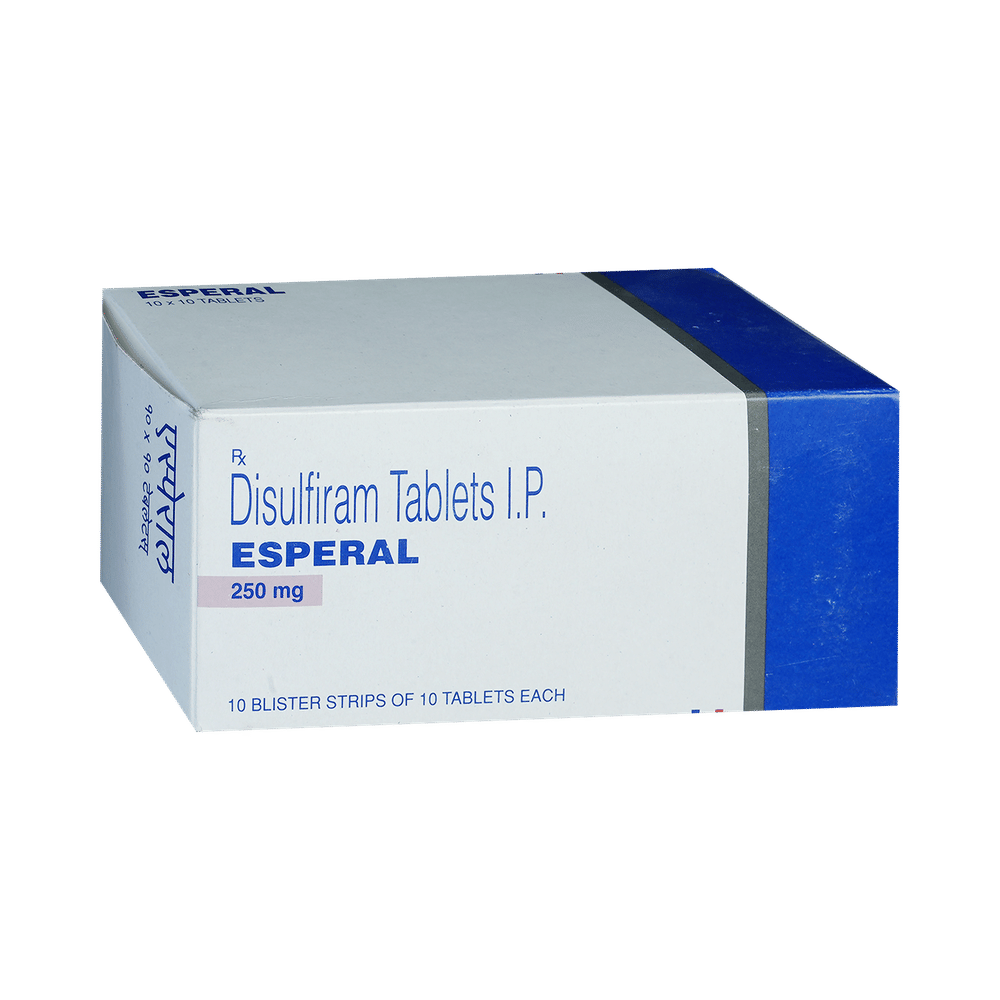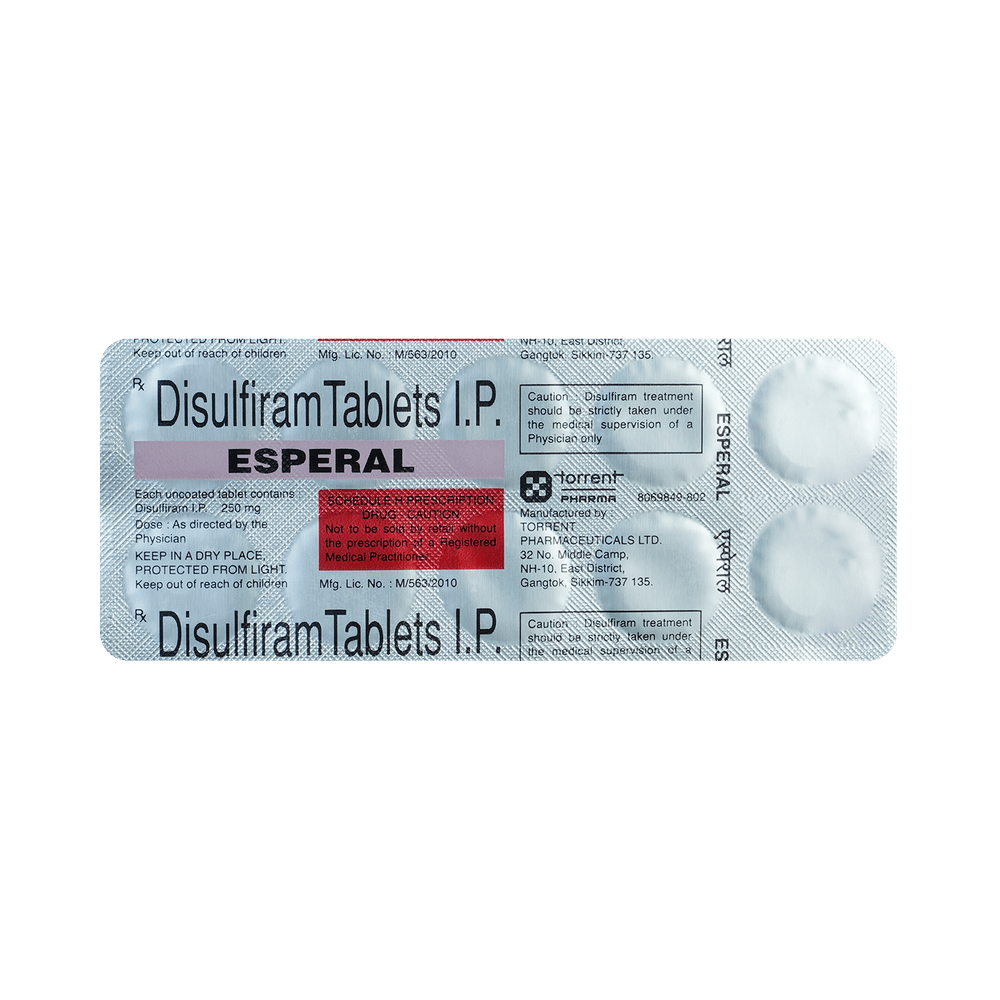 Esperal Tablet is a medicine used in the treatment of alcohol addiction. It works by producing interaction with alcohol and thereby causing unpleasant effects like nausea, flushing of the face, headaches. Thus, it discourages the patient from taking alcohol while on this medication. Esperal Tablet may be taken with or without food. Take this medicine as advised by your doctor and if you have missed a dose, take it as soon as you remember. Do not skip any doses and finish the full course of treatment. This medication mustn't be stopped suddenly without talking to your doctor. Remember while taking this medication, avoid alcohol in all forms including beer, wine, aftershave lotions, mouthwash, vinegar, and liquid medications.Some common side effects of using this medication are headache, fatigue, drowsiness, decreased libido, and metallic taste. Initially, it may also cause dizziness and sleepiness, so do not drive or do anything that requires mental focus until you know how this medicine affects you. It is important to know that you should take this medicine in combination with a counseling program as it will provide extra help to maintain abstinence from alcohol. Remember it will take time, support, willpower, and determination to readjust the habit of not drinking.