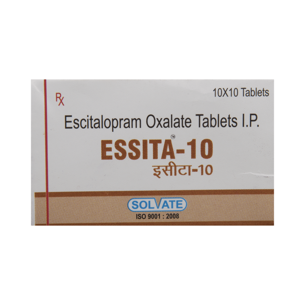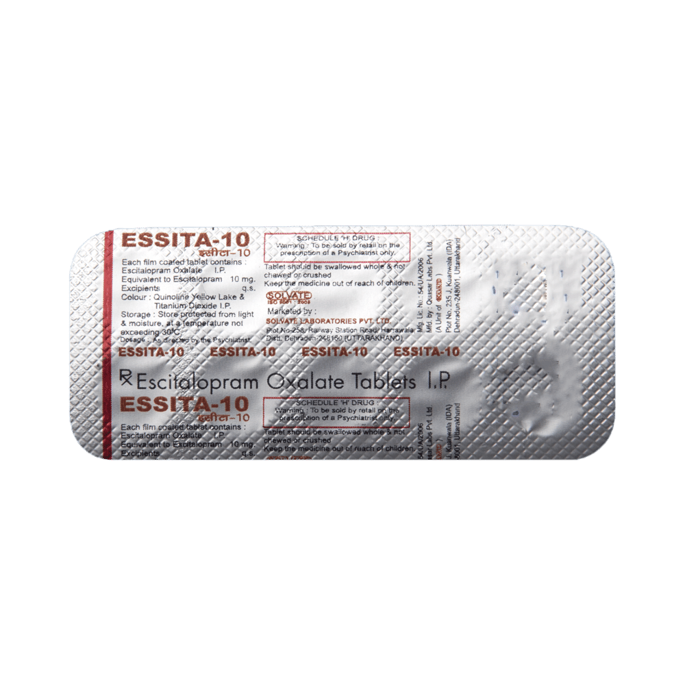 Essita 10 Tablet is widely prescribed to treat depression and other mental health conditions like anxiety, panic disorder, and obsessive-compulsive disorder. It is a type of antidepressant known as a selective serotonin reuptake inhibitor (SSRI). Essita 10 Tablet helps recover from depression by improving mood and relieving anxiety and tension. It can be taken with or without food. The dose and how often you need it will be decided by your doctor based on the amount needed to control your symptoms. Your doctor may start you on a lower dose and increase it gradually. Do not change the dose or stop taking it without talking to your doctor, even if you feel well. Doing so may make your condition worse or you may suffer from unpleasant withdrawal symptoms such as anxiety, restlessness, palpitations, dizziness, sleep disturbances.To get the most benefit, take this medicine regularly at the same time each day. Your doctor may advise you to take it in the morning if you have trouble sleeping. It may take a few weeks before you start feeling better. Let your doctor know if you do not see any improvement even after 4 weeks.Some common side effects of this medicine include nausea, fatigue, increased sweating, insomnia (difficulty in sleeping), decreased sexual drive, delayed ejaculation, and women may experience difficulties achieving orgasm. Some people may experience sleepiness after taking this medicine. Let your doctor know straight away if you develop any sudden worsening of mood or any thoughts about harming yourself.Before taking Essita 10 Tablet, you should tell your doctor if you have epilepsy (seizure disorder or fits), diabetes, liver or kidney disease, any heart problems, or are currently taking medicines for depression known as MAO inhibitors. These may affect your treatment. Please tell your doctor about all the medicines you are taking to make sure you are safe.